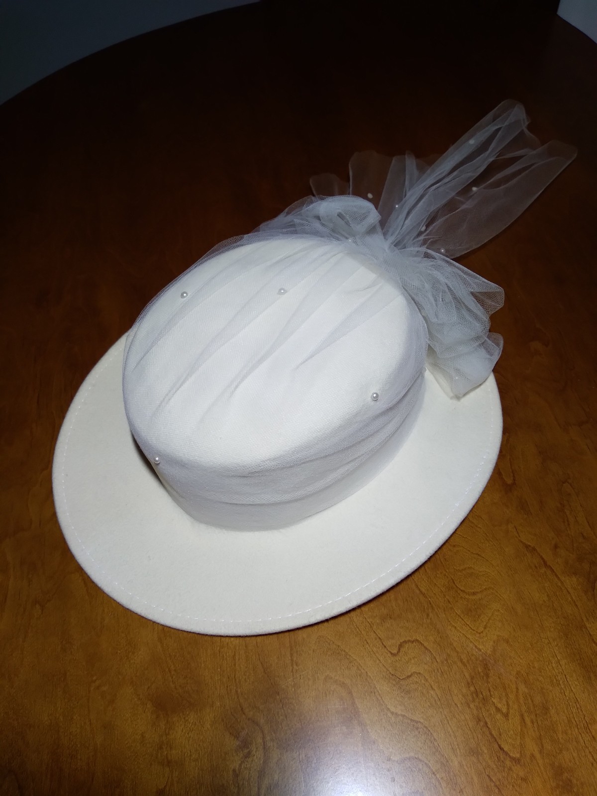 Vintage Wool Church Hat Cream Formal Dress Hat Pearl Beaded Tulle Derby Made USA