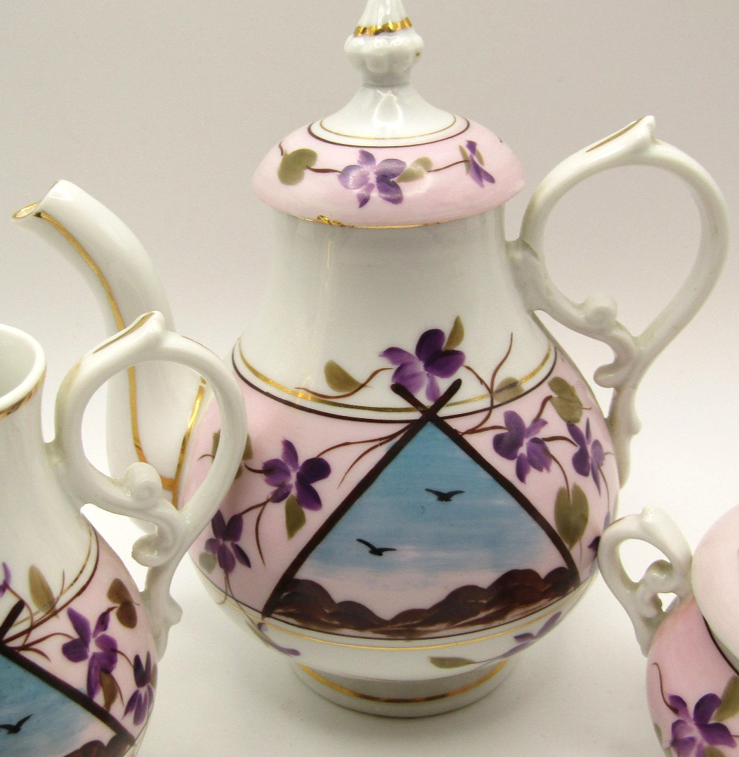 как выглядит VINTAGE MINIATURE PORCELAI TEA SET/TEA POT CREAMER, SUGAR-MADE IN JAPAN VIOLETS фото