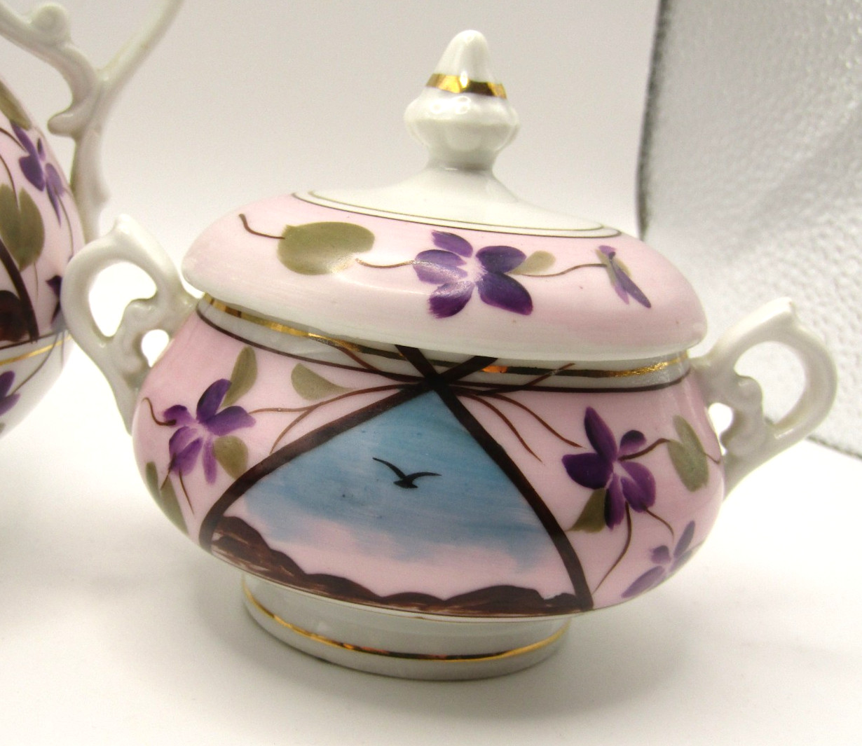 VINTAGE MINIATURE PORCELAI TEA SET/TEA POT CREAMER, SUGAR-MADE IN JAPAN VIOLETS
