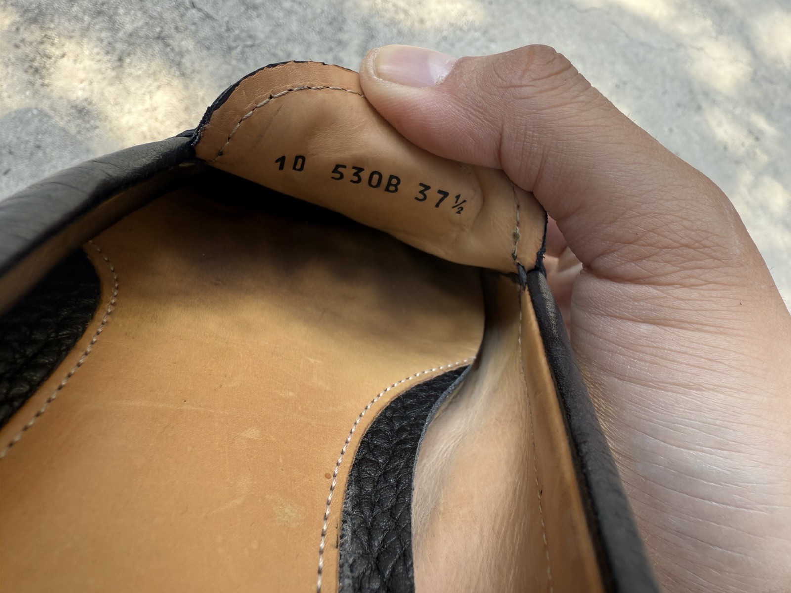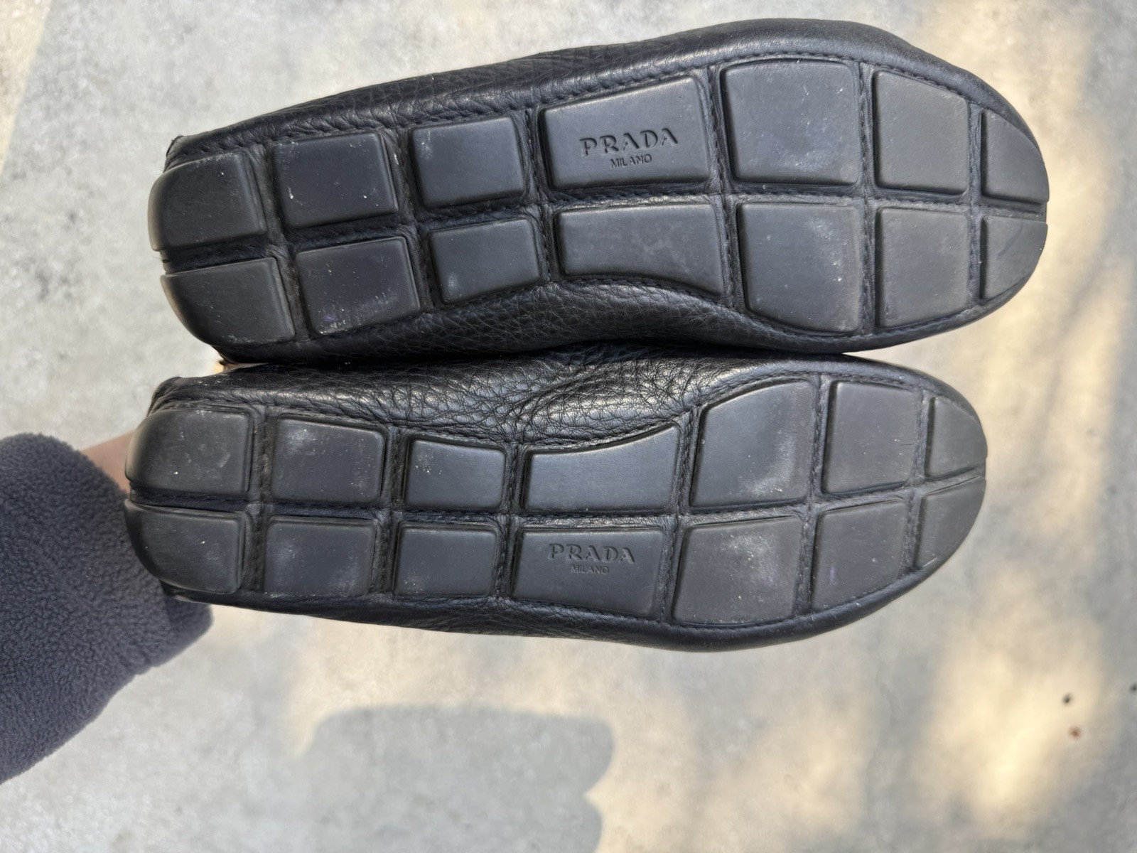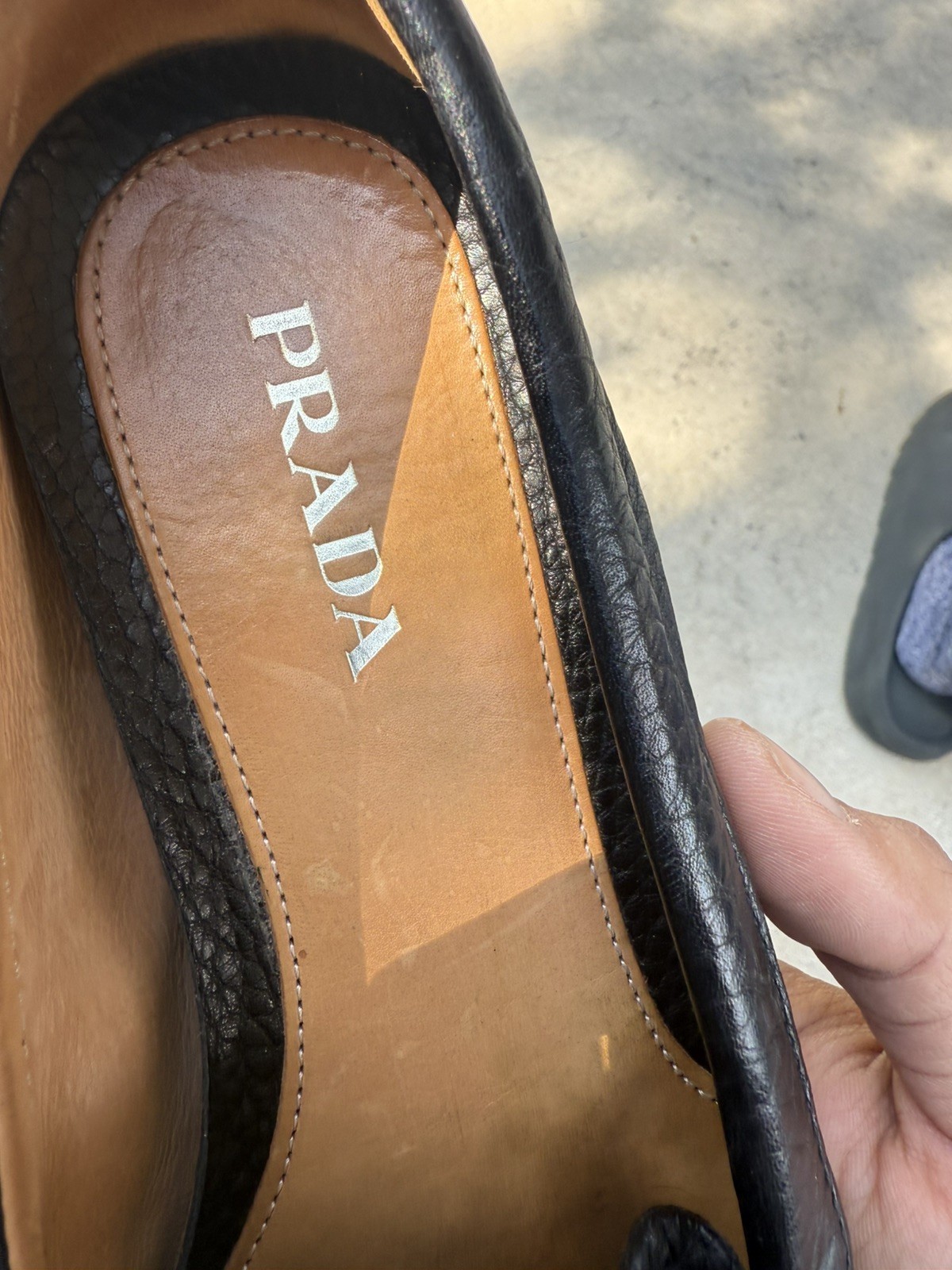 как выглядит Prada Cross Grain Leather Black Loafers. Sz 7 37.5 With bow and gold accents фото