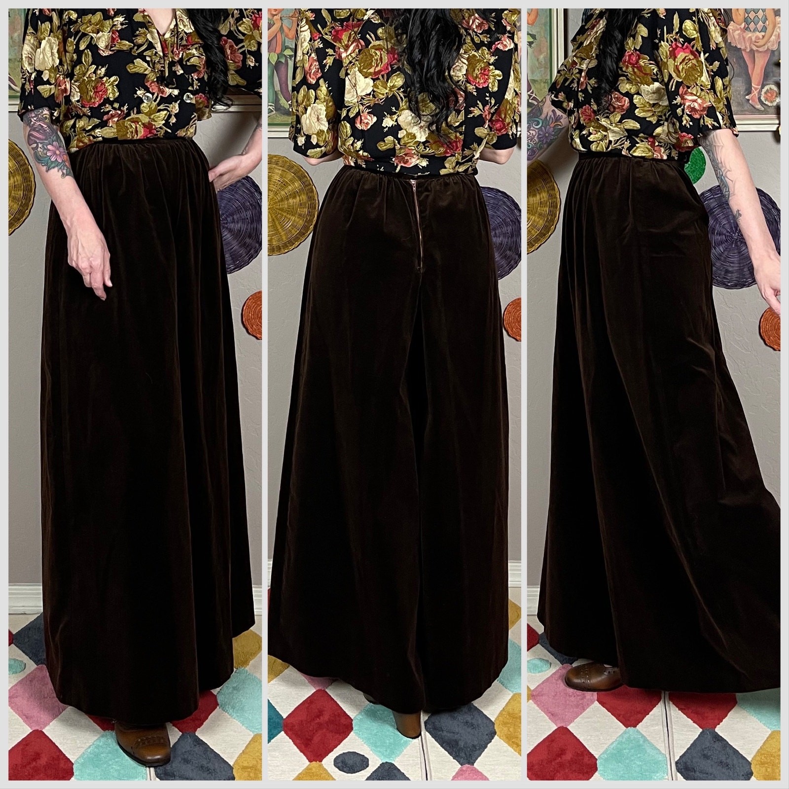 как выглядит Vintage 1960s Brown Velvet High Rise Wide Leg Palazzo Pants 25"/26" Waist фото