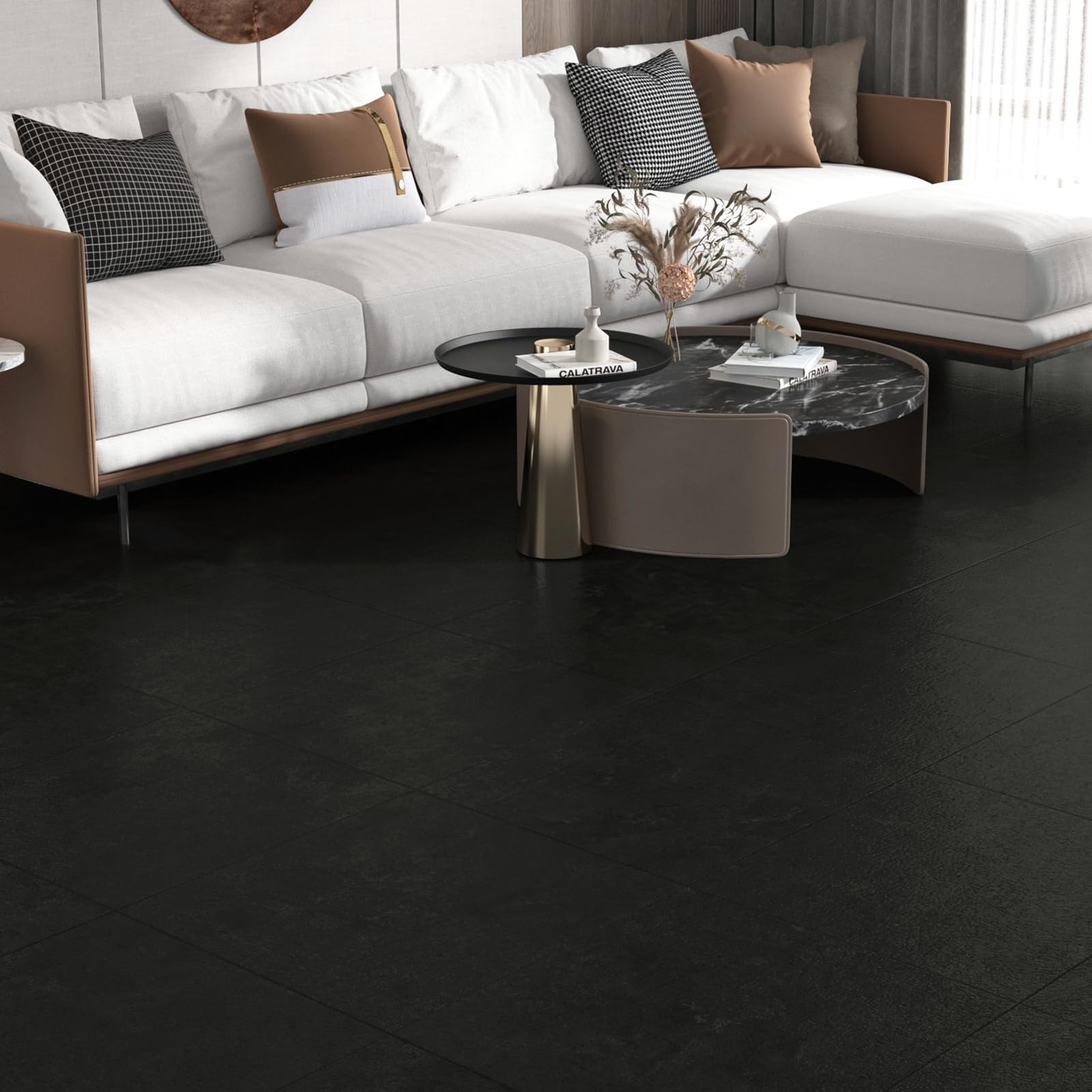 как выглядит 16 Pack Black Granite Peel and Stick Floor Tiles Waterproof Charcoal Black La... фото