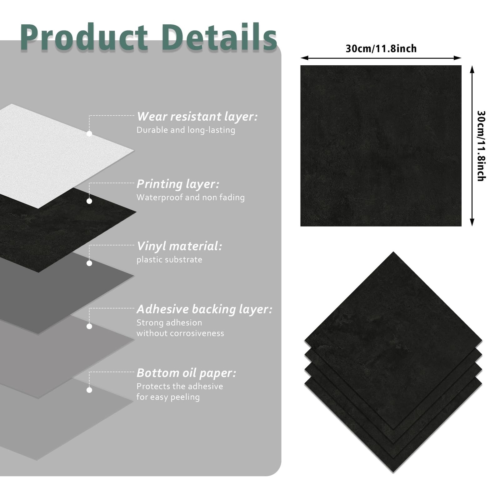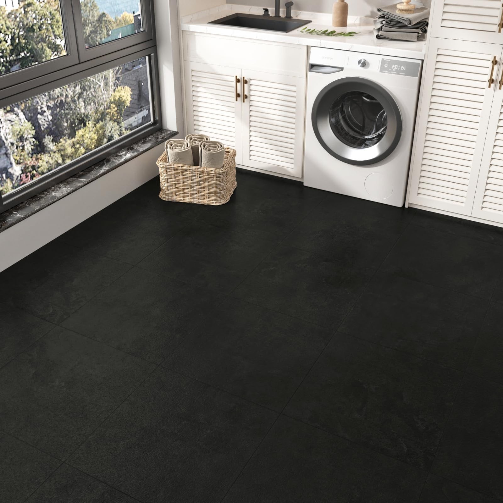 16 Pack Black Granite Peel and Stick Floor Tiles Waterproof Charcoal Black La...