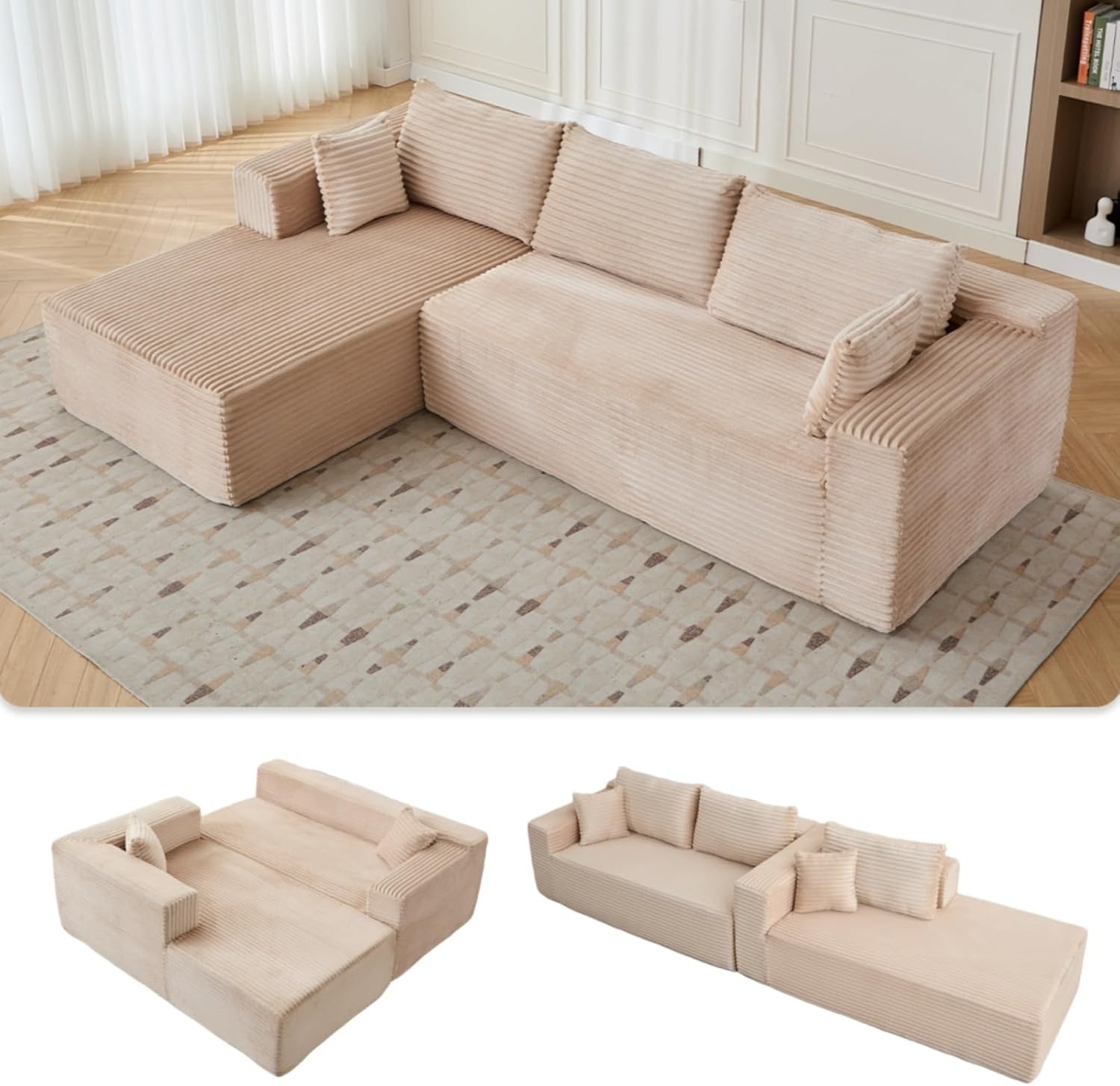 как выглядит 110" L-Shaped Boneless Sofa Corduroy Compressed Sectional Couch with Chaise фото
