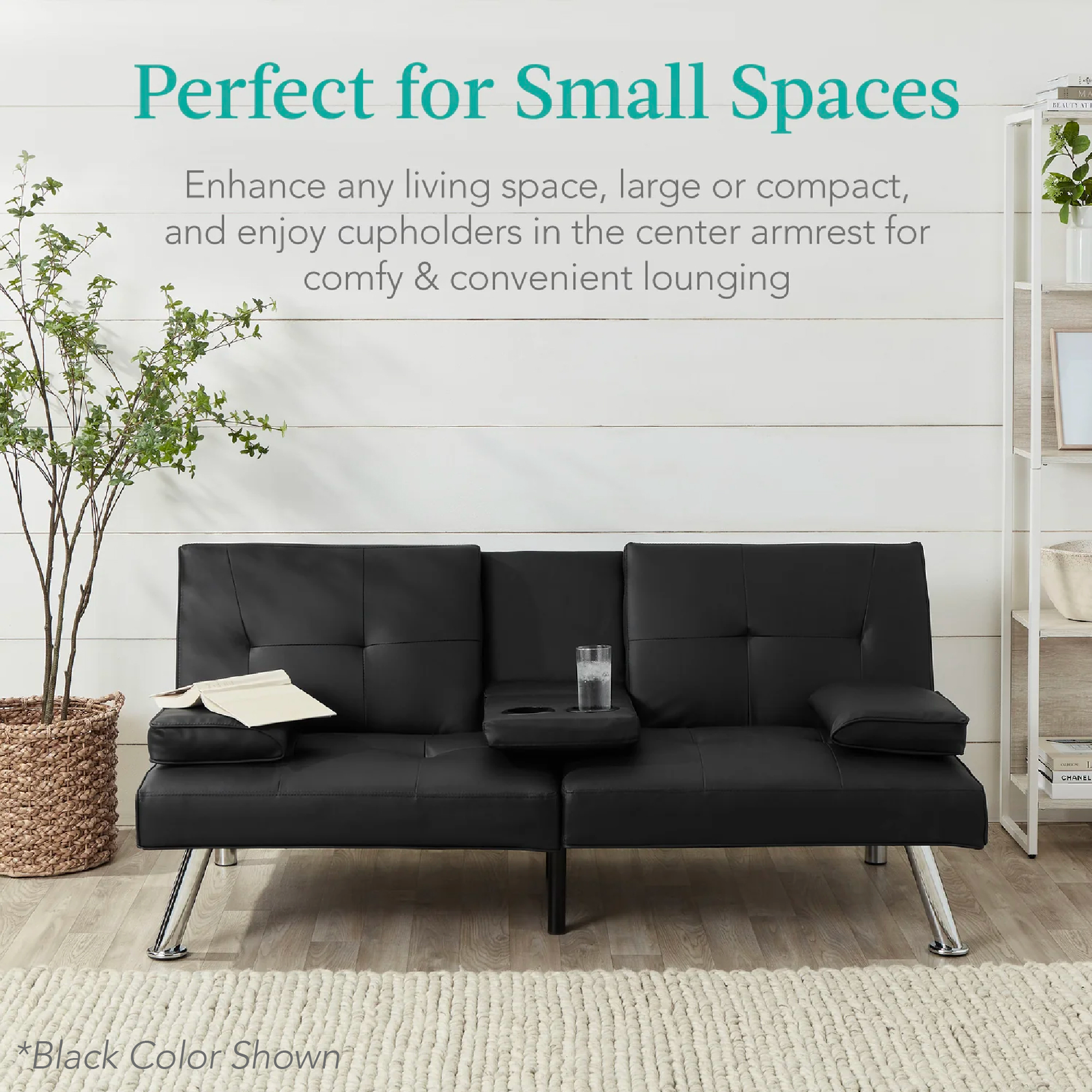 как выглядит Faux Leather Upholstered Convertible Sofa Bed Futon w/ 2 Cupholders фото