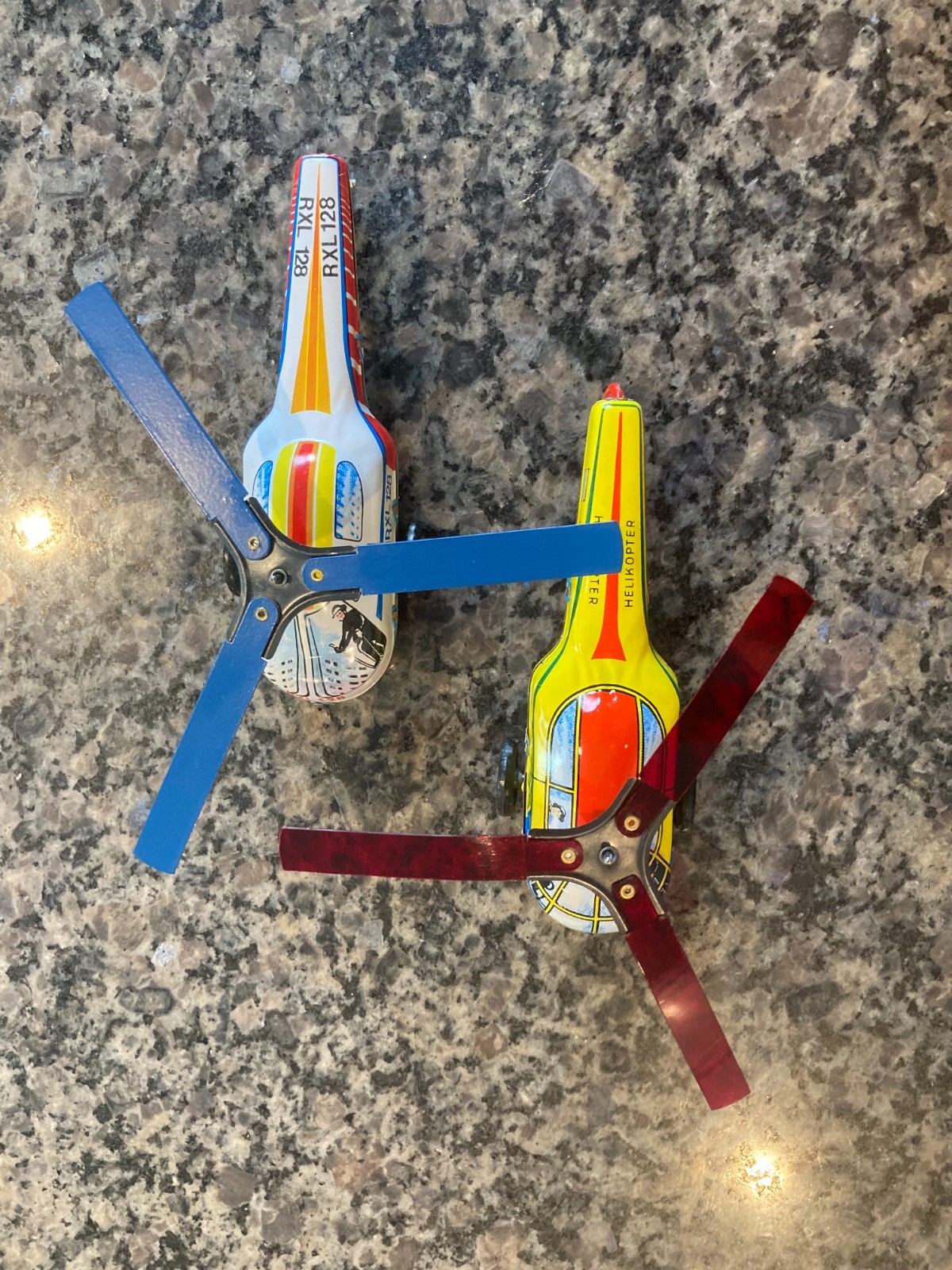 как выглядит A PAIR OF NOS, VINTAGE, TIN, FRICTION DRIVEN LEMEZARU GYAR HELICOPTERS IN BOXES фото