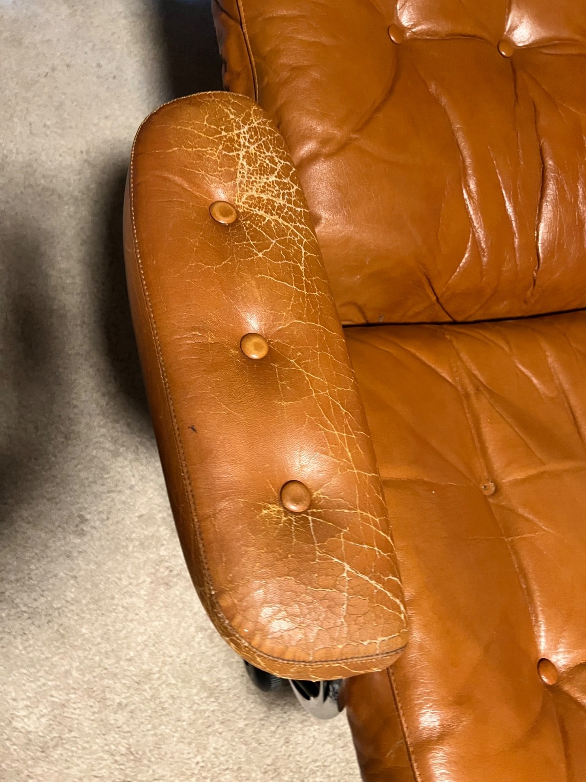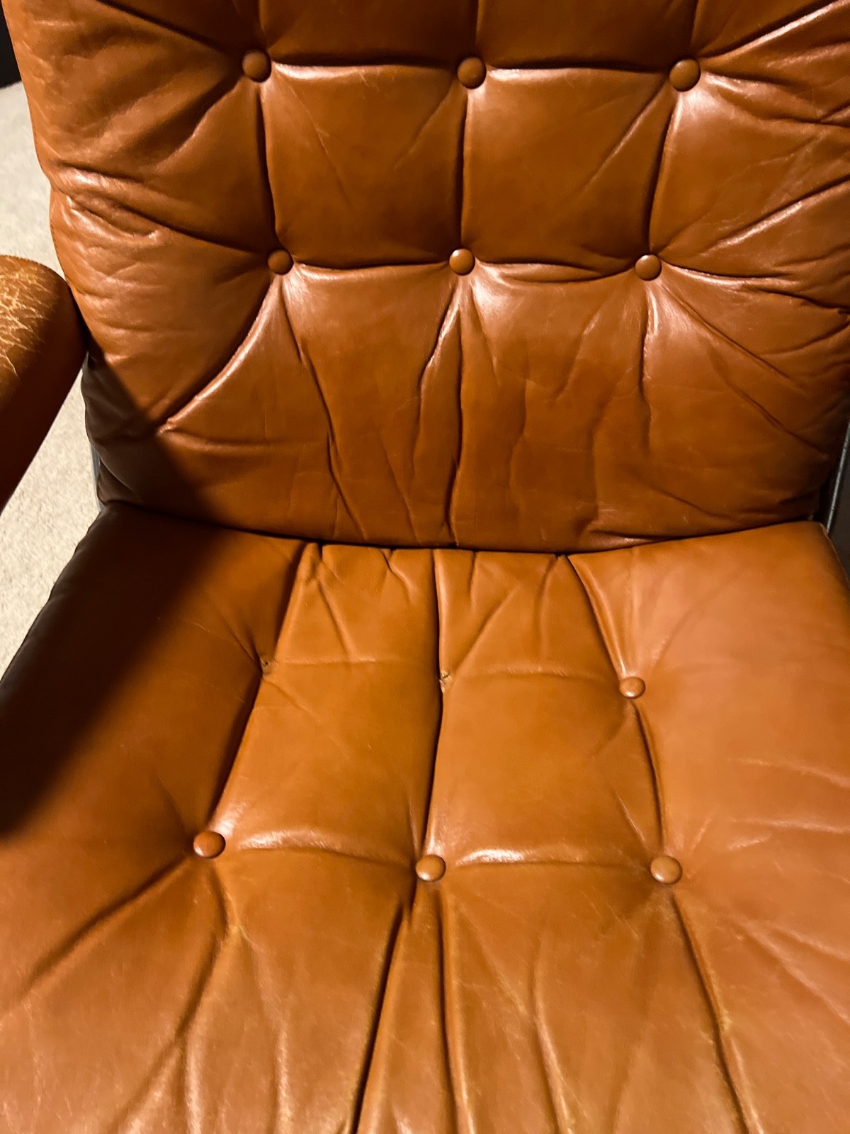 как выглядит Vintage Ekornes Stressless Brown Leather Recliner And Ottoman Chrome Base фото