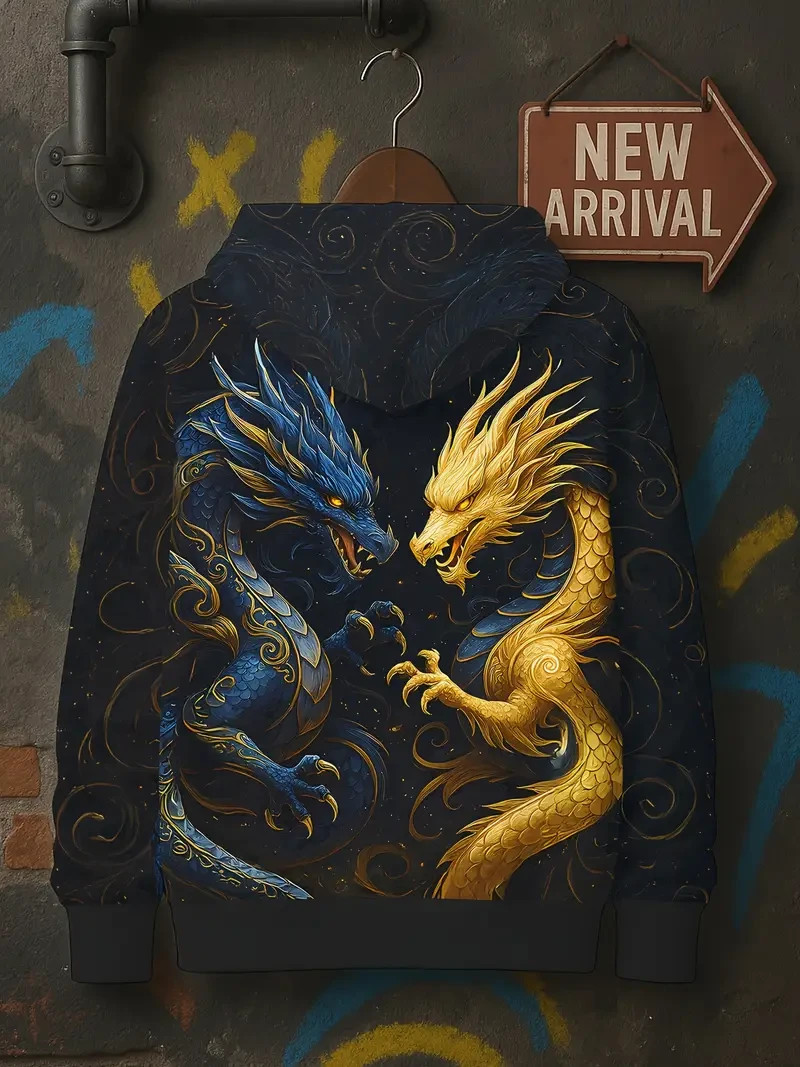 3D Dual Dragon Hoodie Golden Blue Mythical Battle Graphic Pullover Sweatshirt