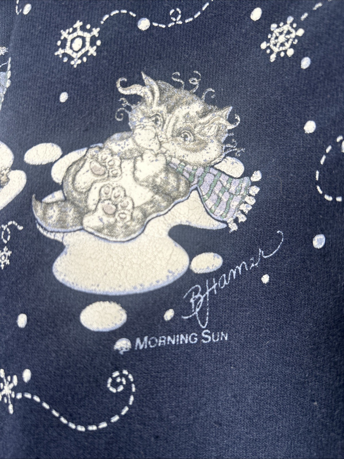 VNTG Morning Sun Women's Sweatshirt XL Blue Embroidered Kittens Play In The Snow
