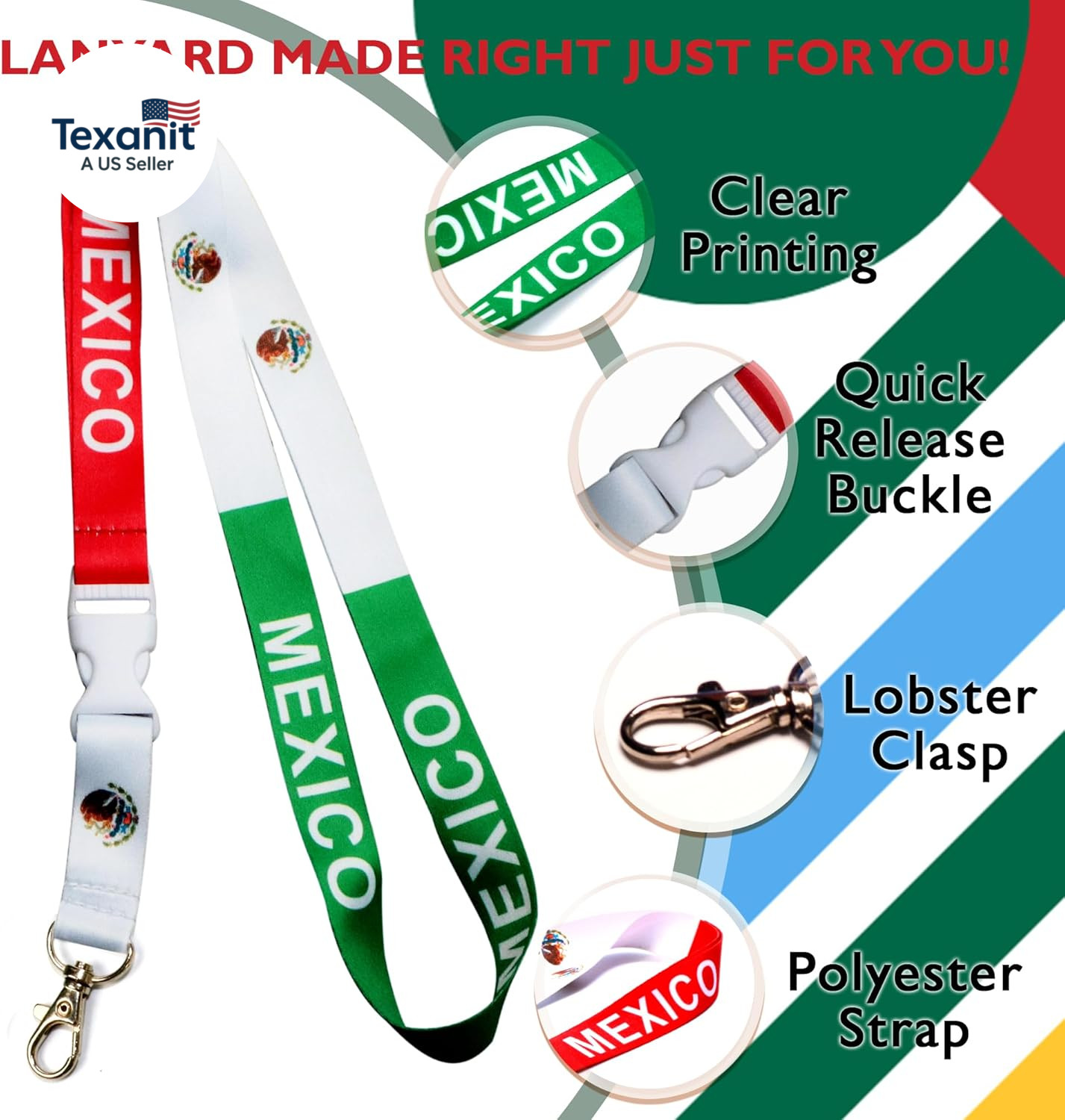 Mexico Flag Lanyard Keychain - Mexican Lanyards for Keys Badge - ID Card Holder