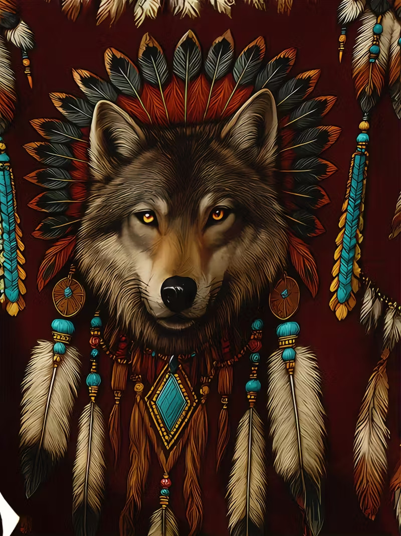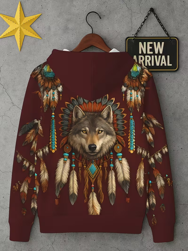 3D Wolf Tribal Feather Hoodie Native-Inspired Art Print Pullover Unisex