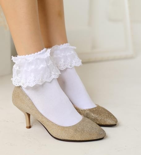 Lace Ruffle Socks for Women, Girls Lace Frilly Socks, White-1 Pairs pearl Lace