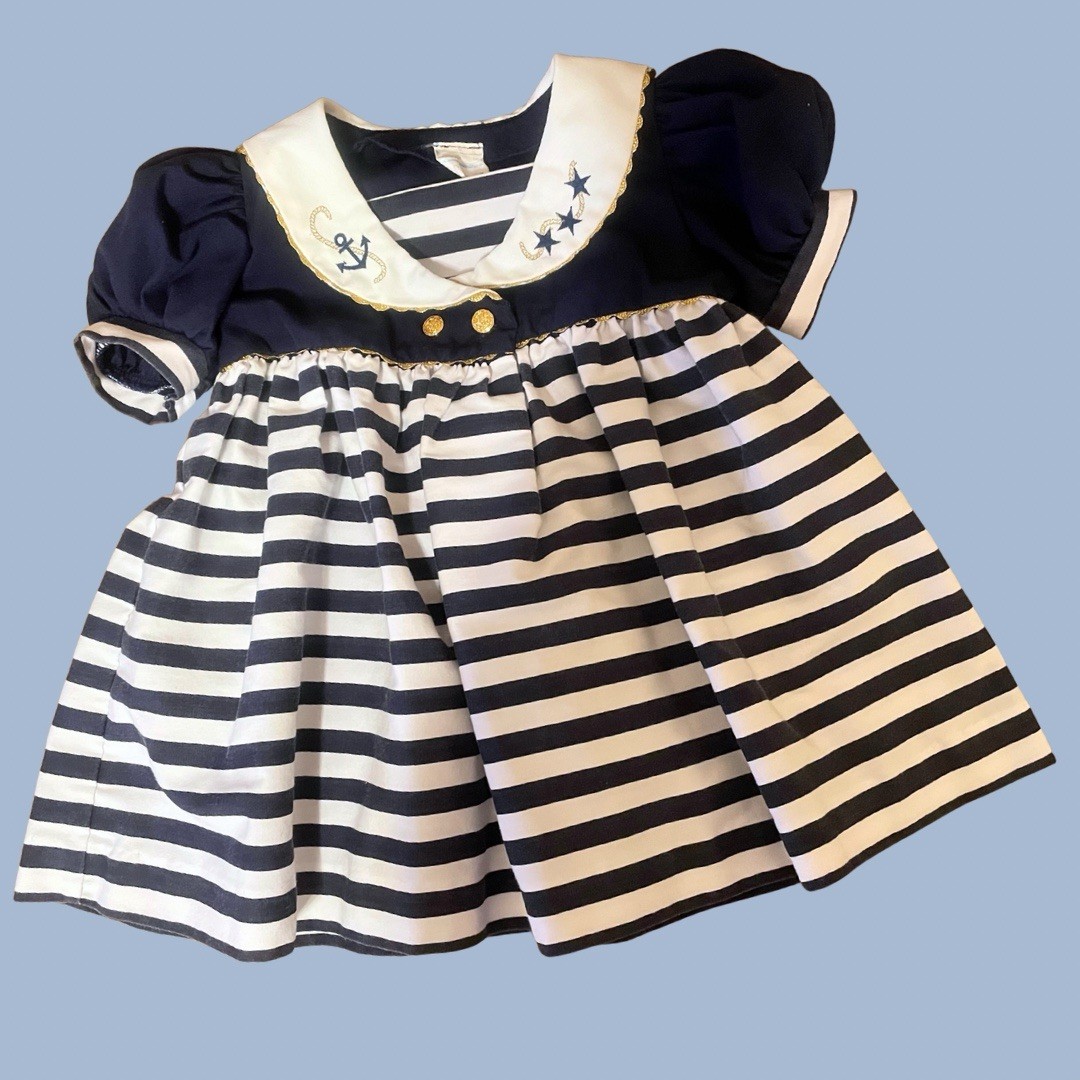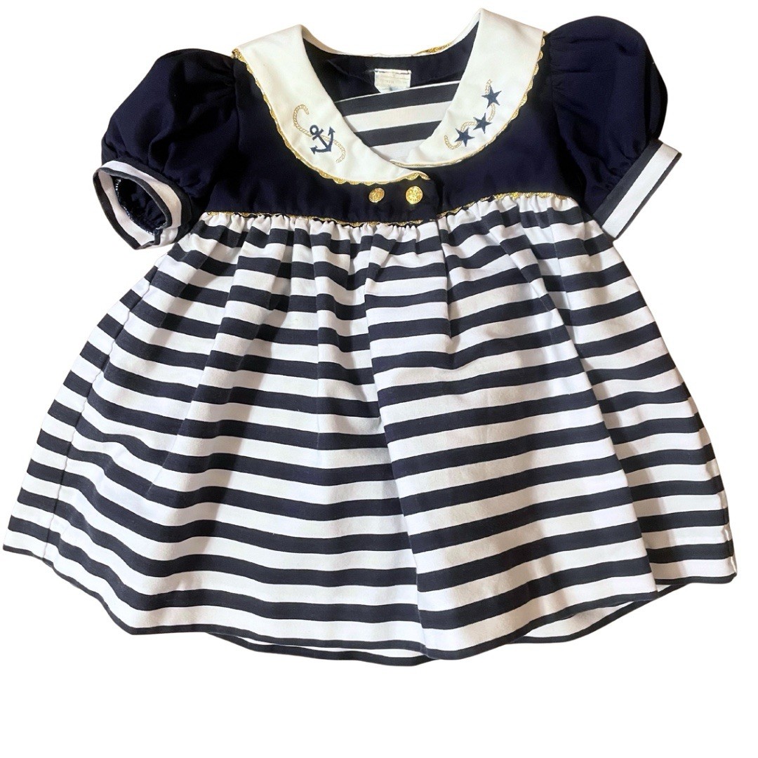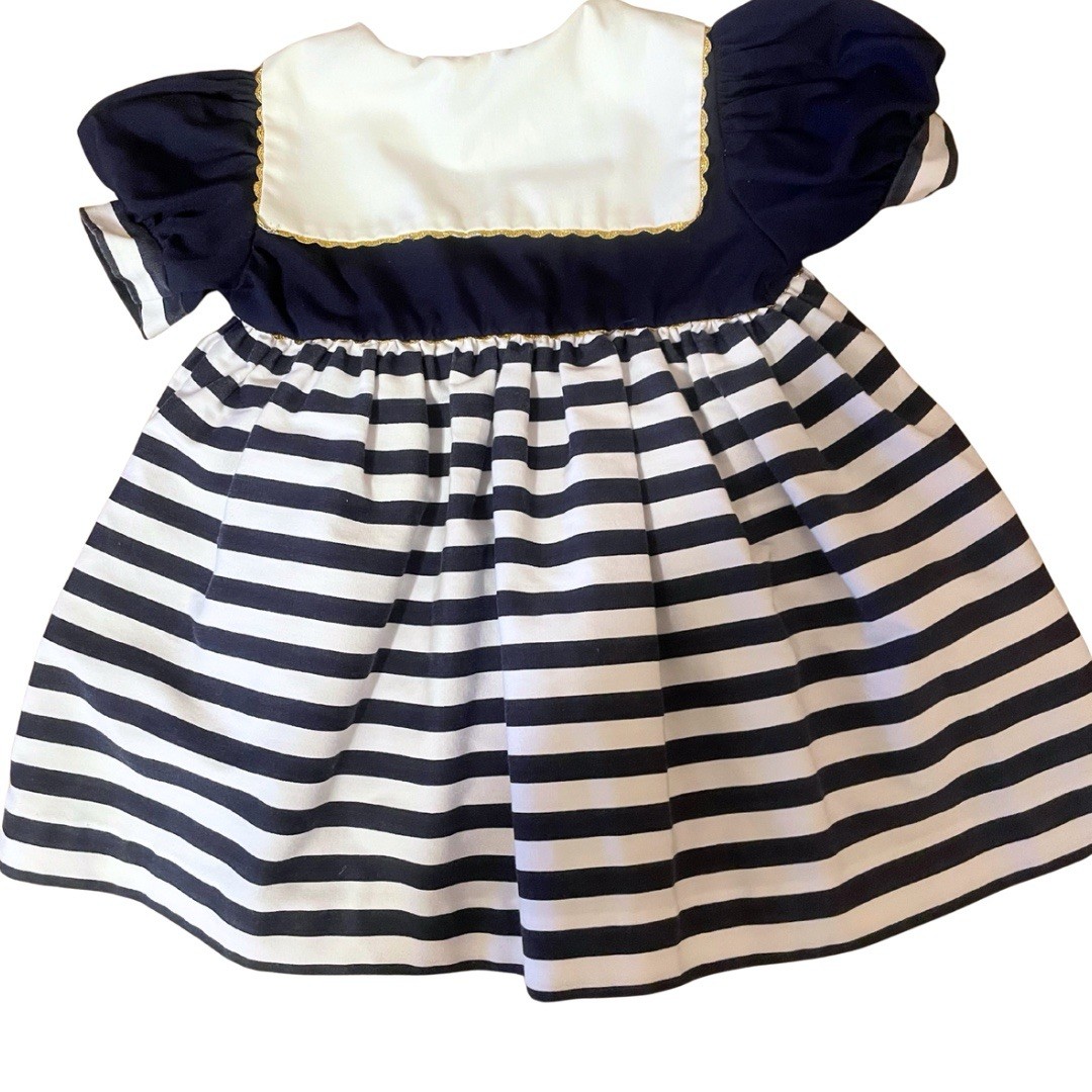 VTG Toddler Girls Navy White Sailor Dress Nautical Gold Trim Sz 18 Months Anchor