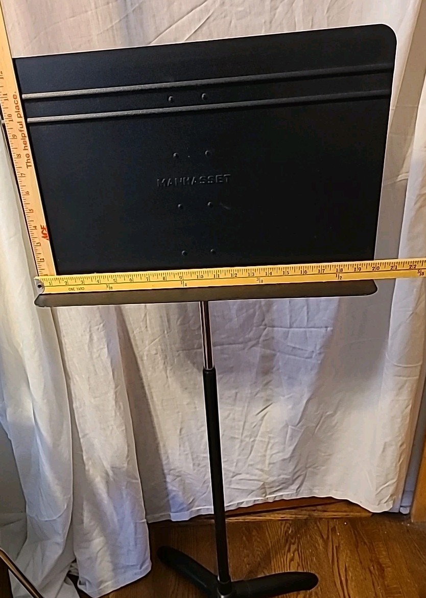 Manhasset music stand, plain solid black metal, tripodal base, detachable light