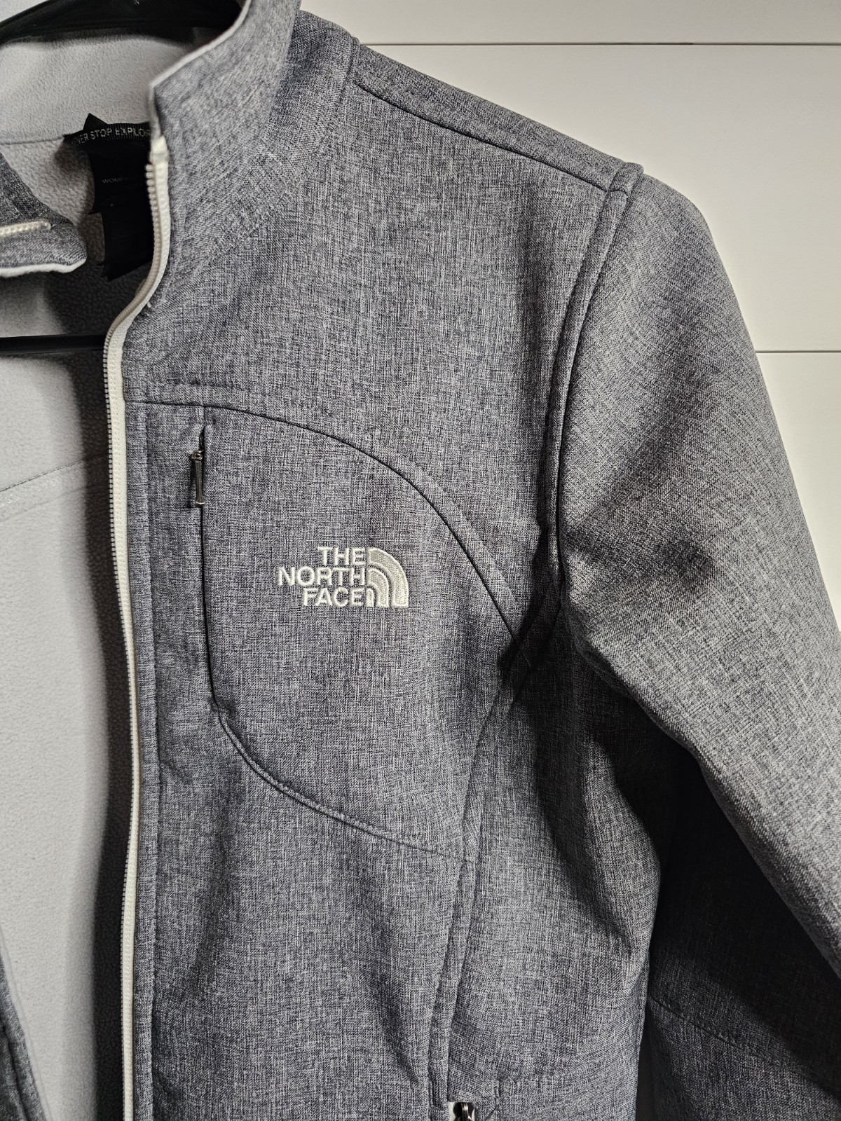 как выглядит THE NORTH FACE Apex Bionic Softshell Jacket Womens Small Gray Green Trim Flaws фото