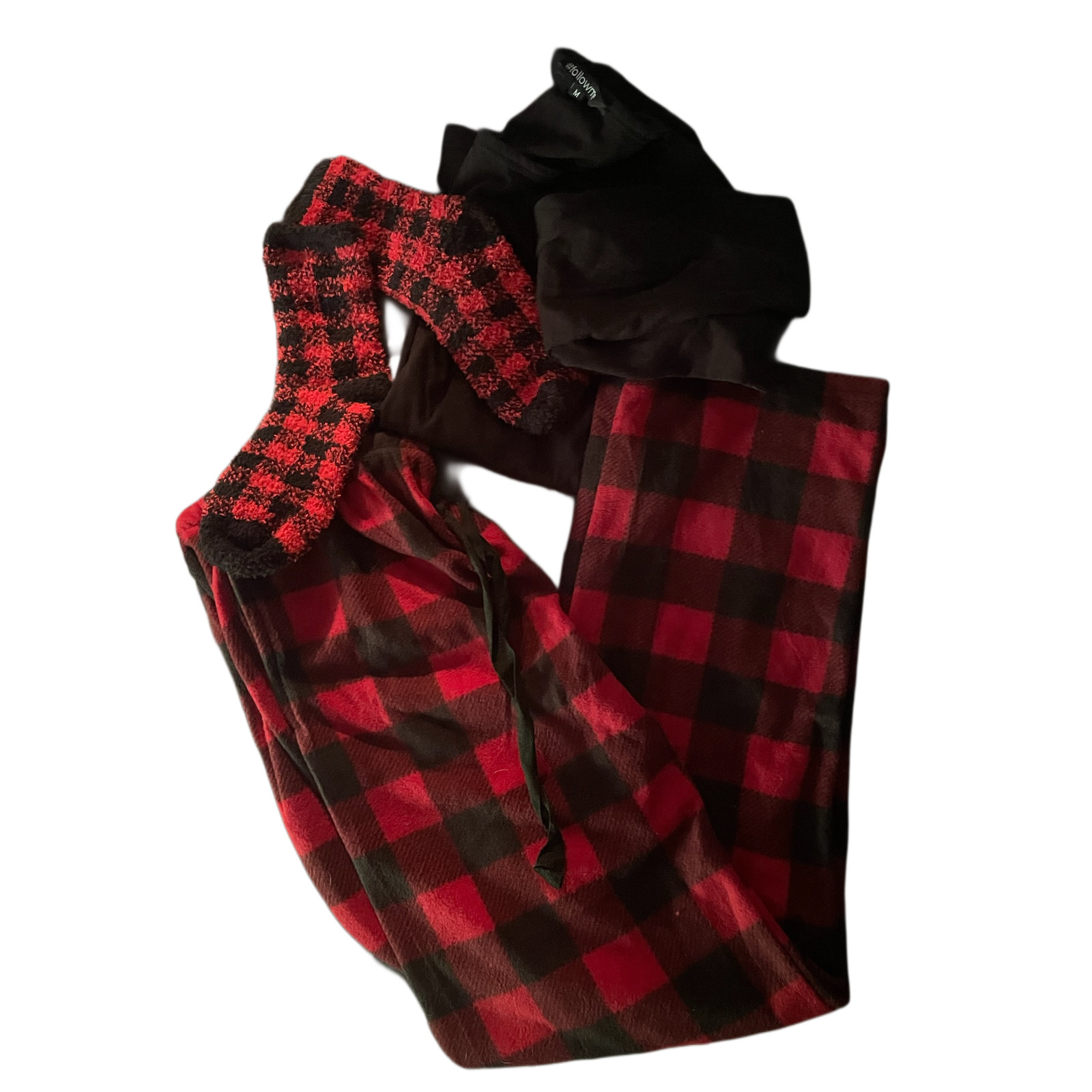 Men s M Holiday Pajama Set Red/Black Plaid Includes New Matching Socks - EUC