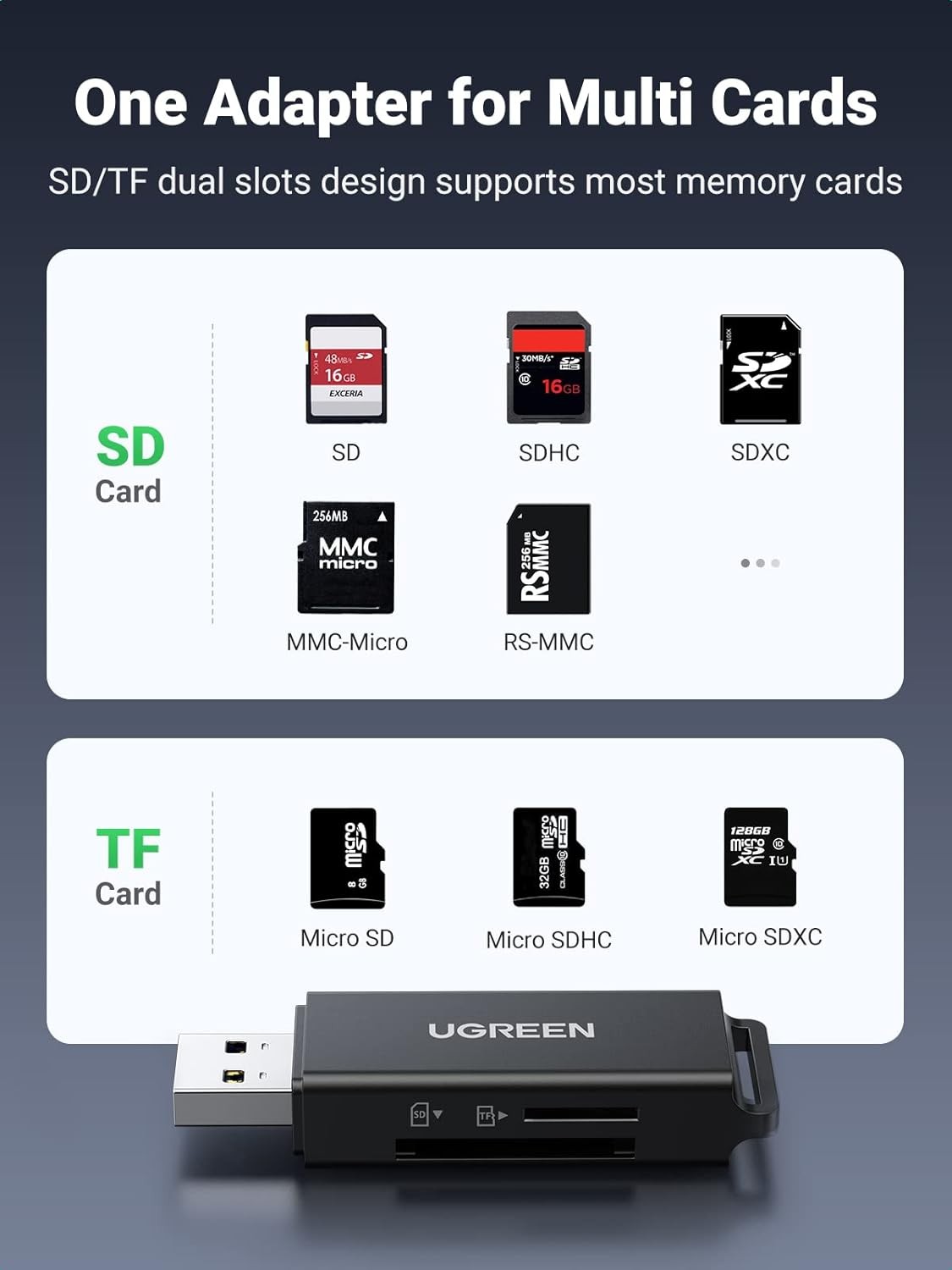 UGREEN SD Card Reader - Portable USB 3.0 Dual Slot Flash Memory Black