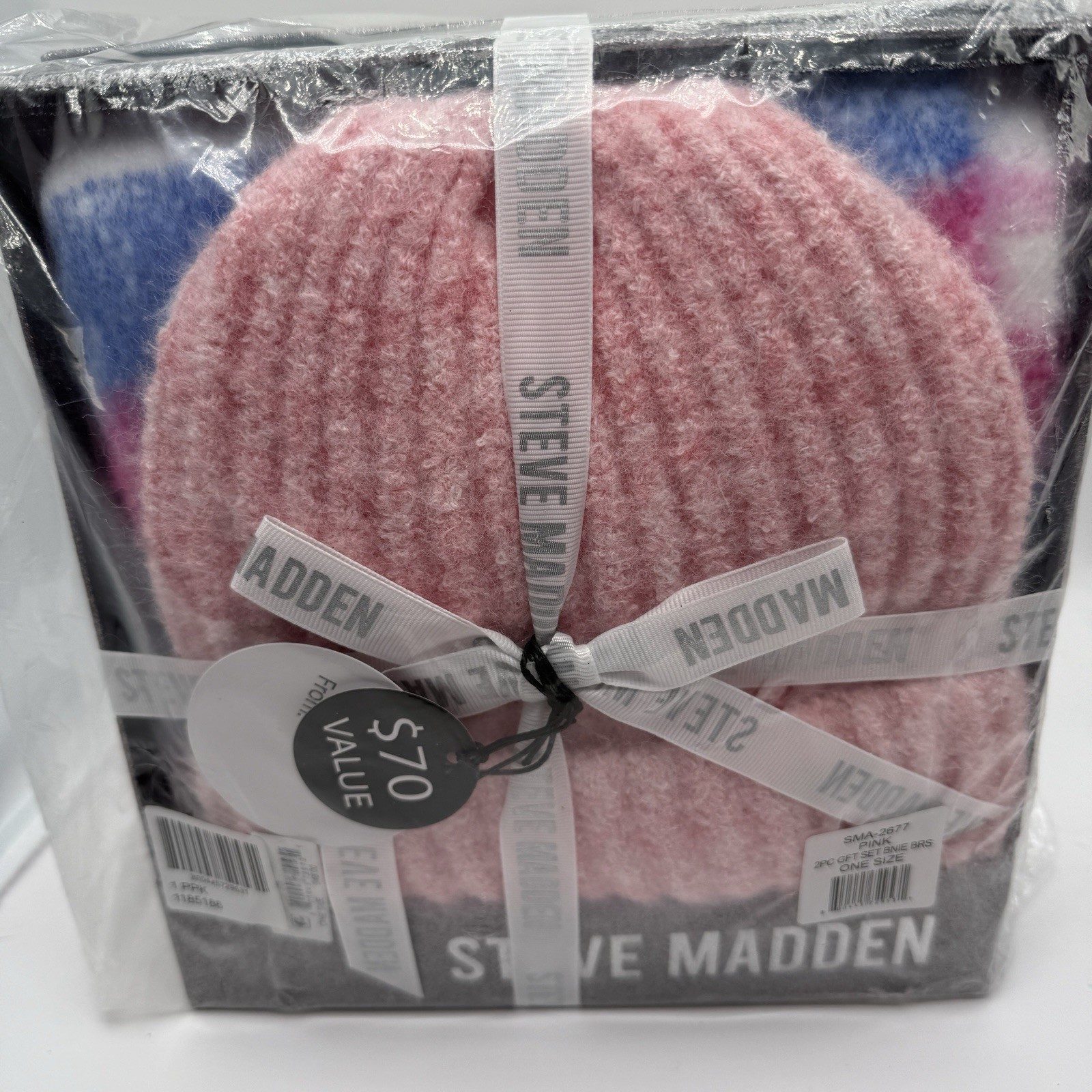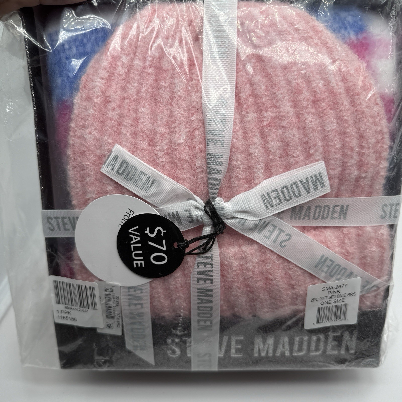 Gift Set Steve Madden Pink Soft Warm Beanie Hat And Multicolor Scarf 2 Piece Set