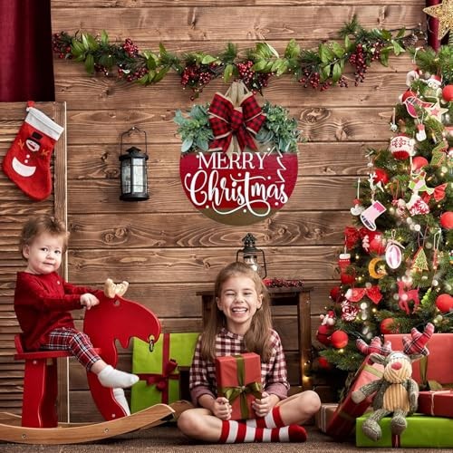 Merry Christmas Hanging Sign for Front Door, Wooden Merry Christmas Wreath