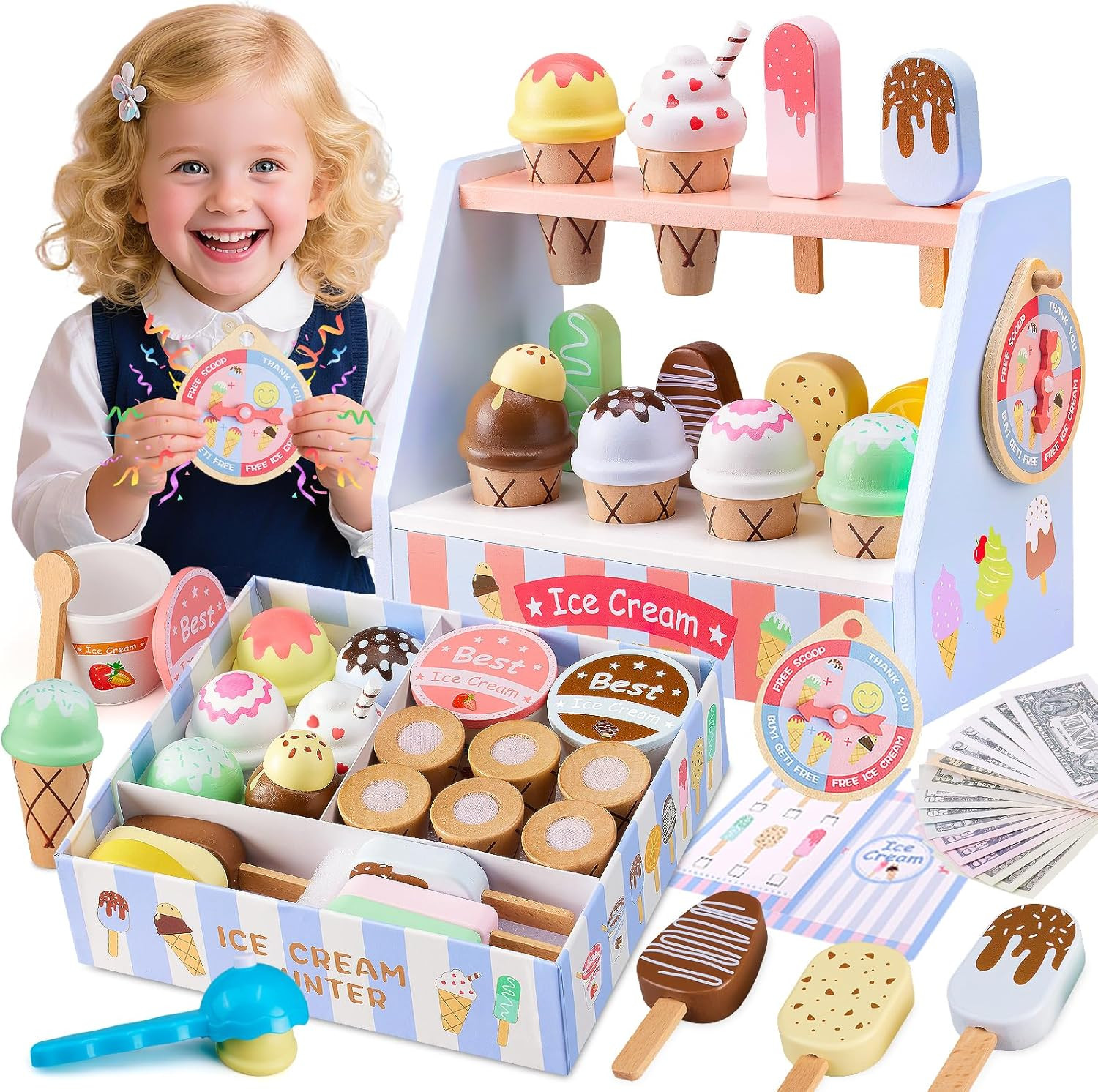 Wooden Ice Cream Toys Set Pretend Play Food Store for Kids Serve Ice Cream Count