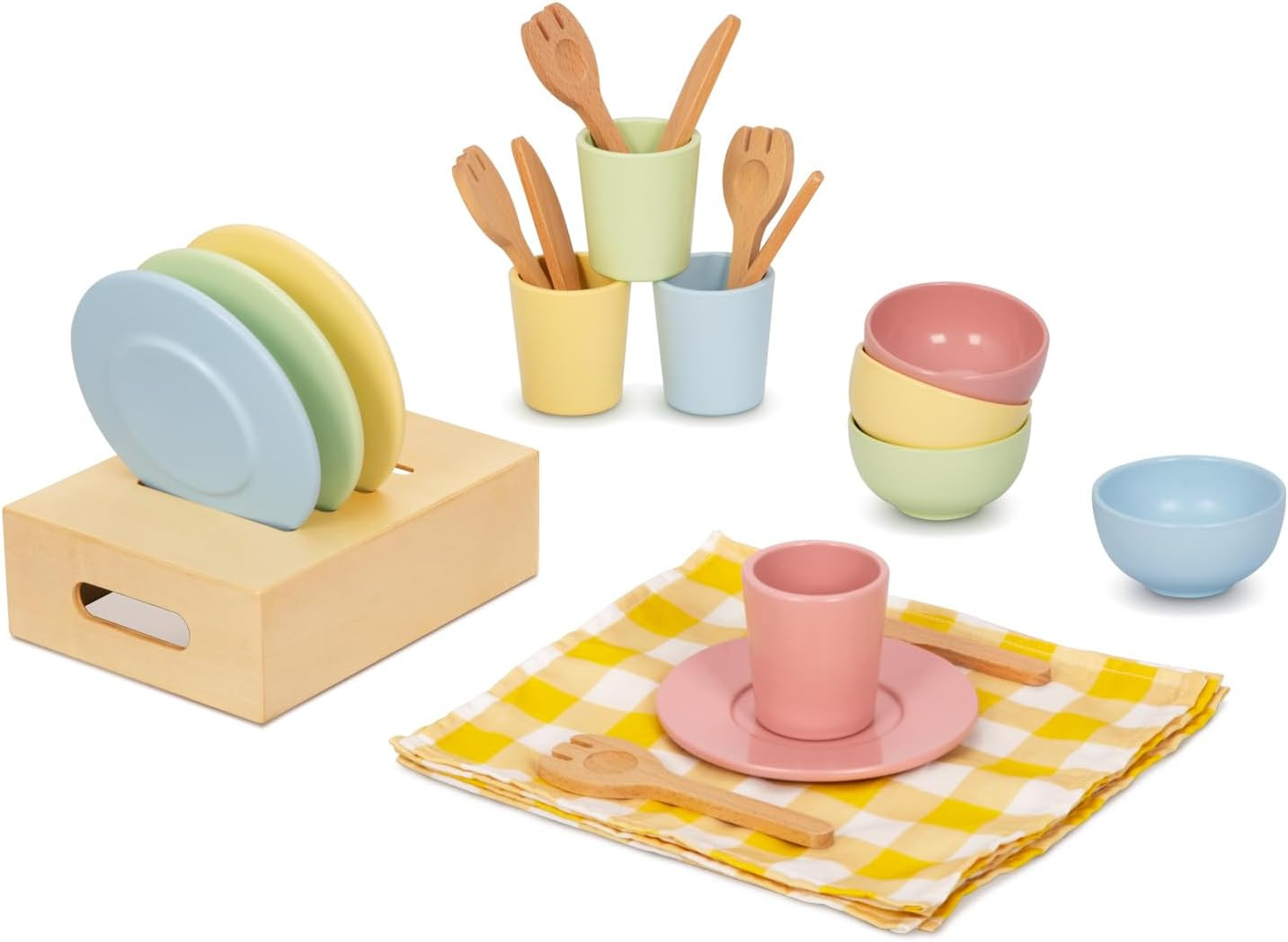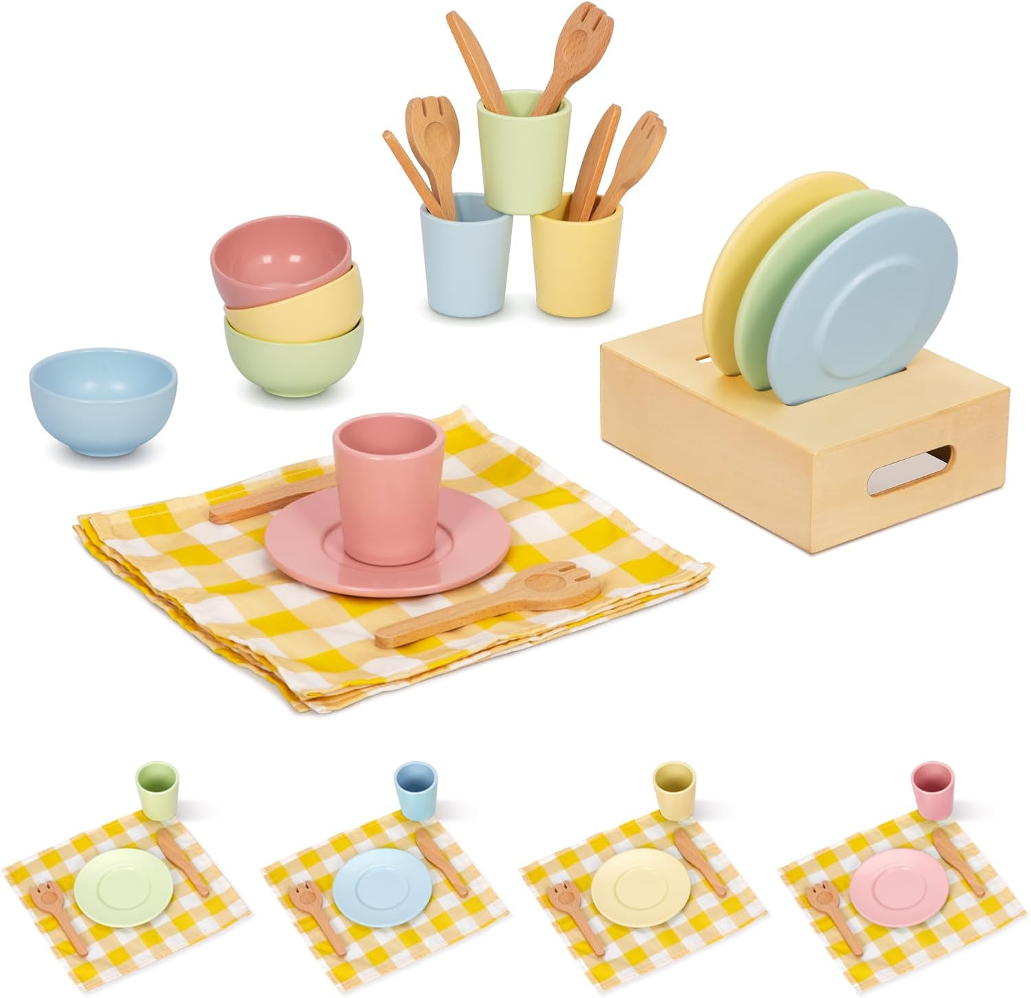 Wooden Play Dishes and Plates for Kids Kitchen Set, 25 PCS Wooden Play Kitchen A