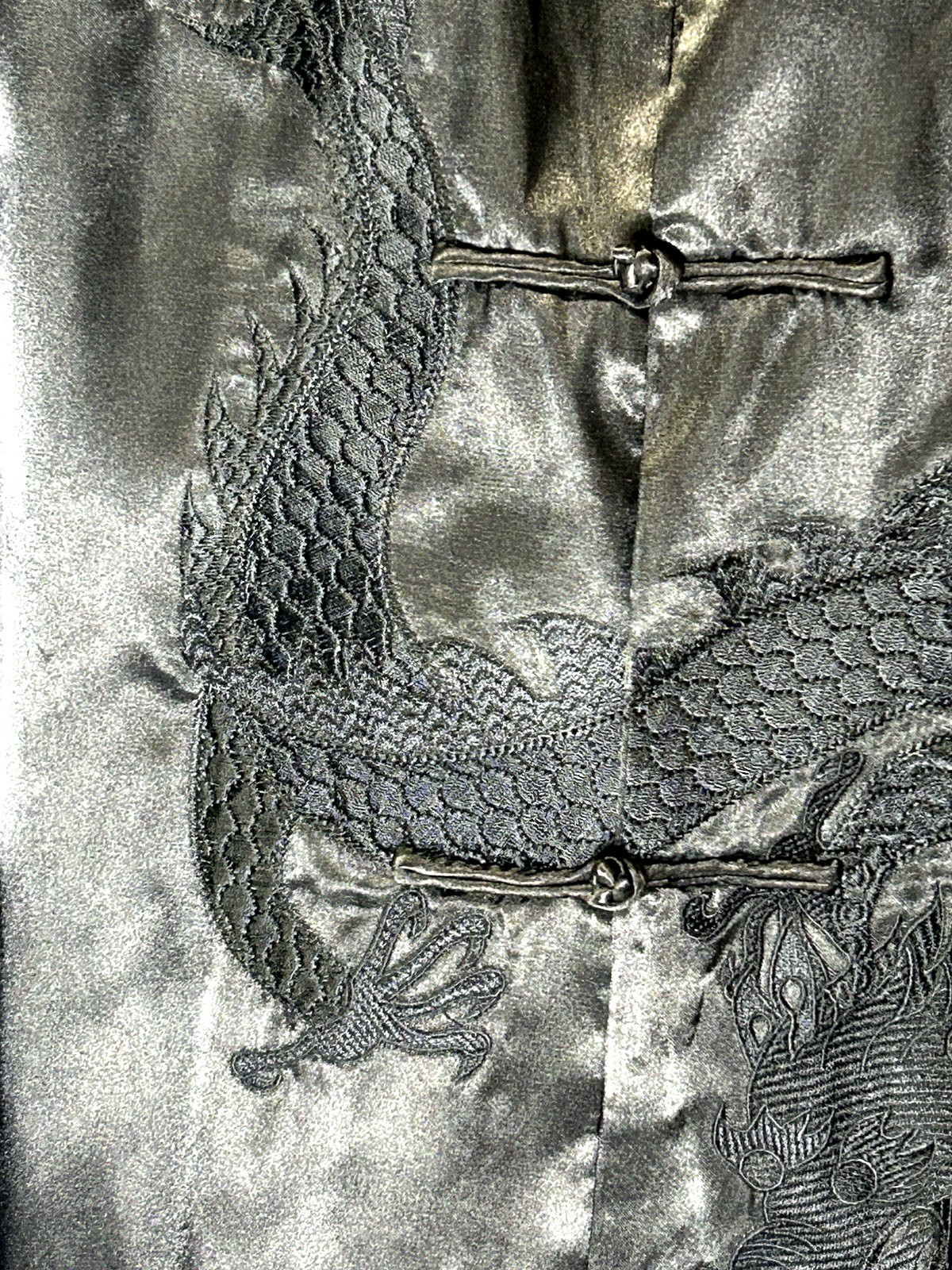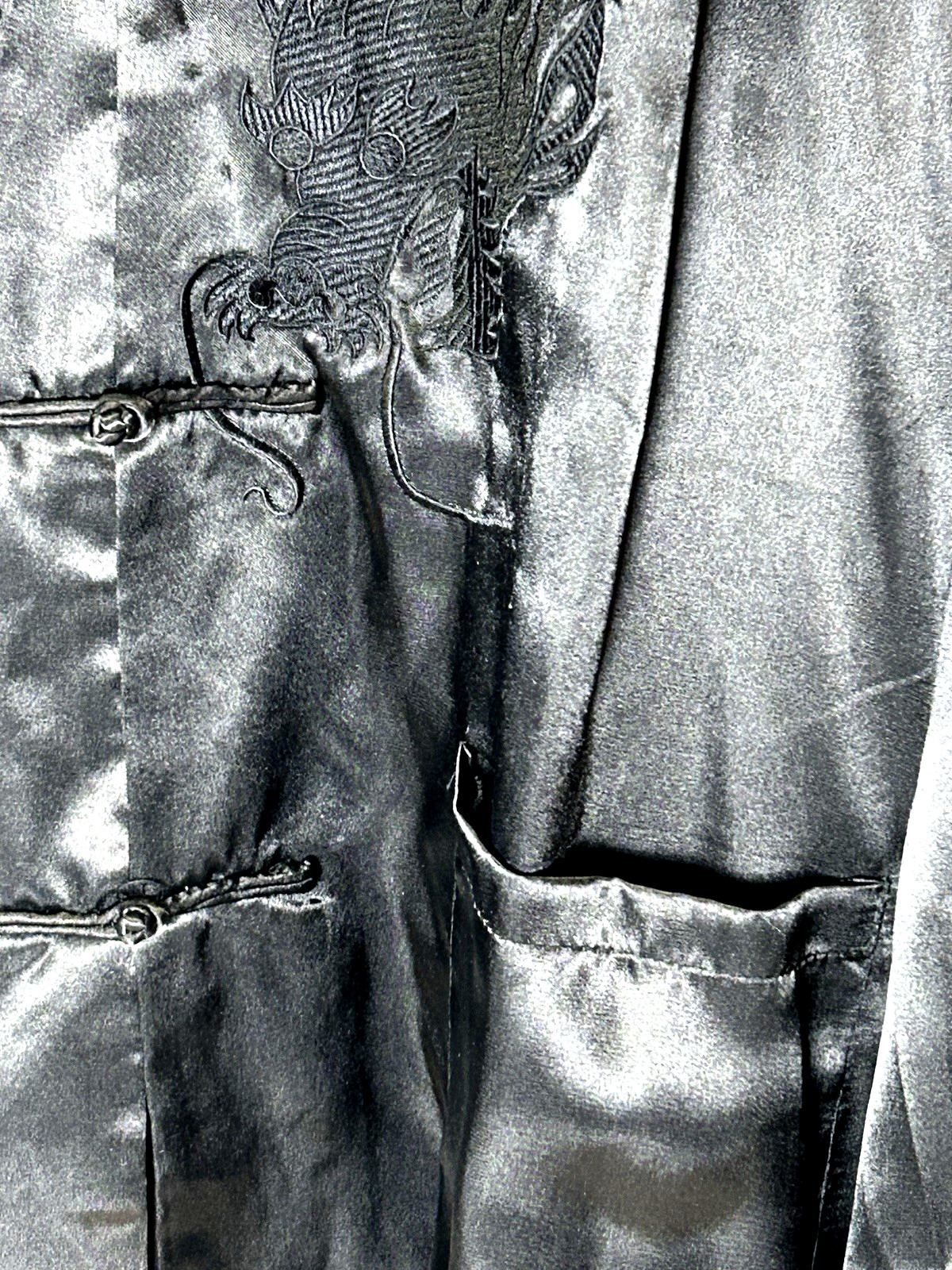 Vintage Ling Hong Traditional Chinese Tang Satin Black Embroidered Dragon Shirt