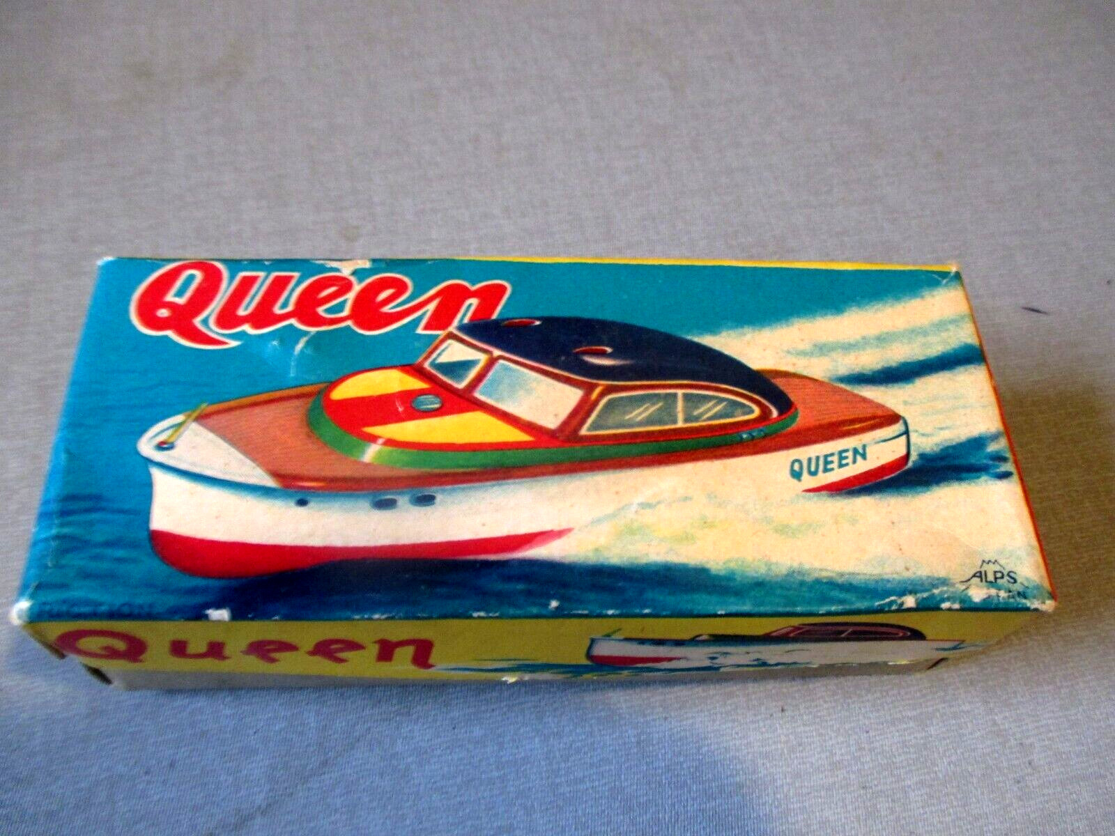 1950's QUEEN SPEEDBOAT- WIND UP TIN VINTAGE TOY W BOX ALAPS JAPAN-6 N-MINT