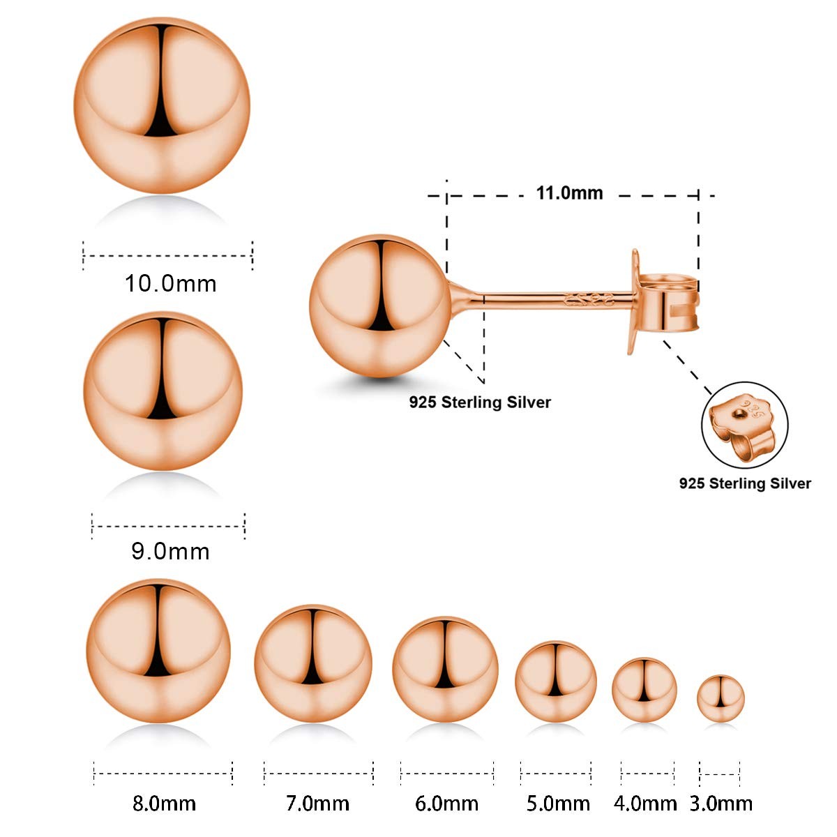 Rose Gold Plated Sterling Silver Ball Stud Earrings 3mm-10mm Options, Simple Pol