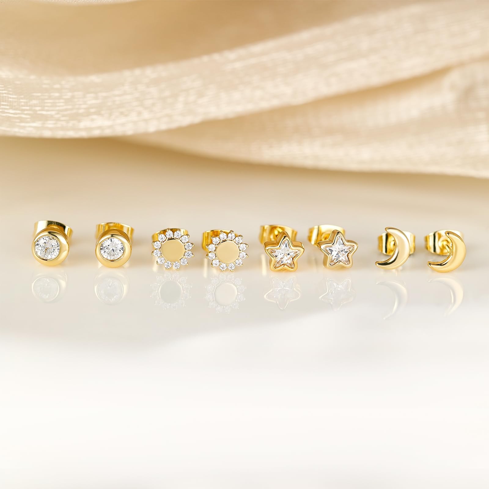 как выглядит 4 Pairs Gold Star Moon Sun Stud Earrings for Women, Hypoallergenic Celestial Ear фото