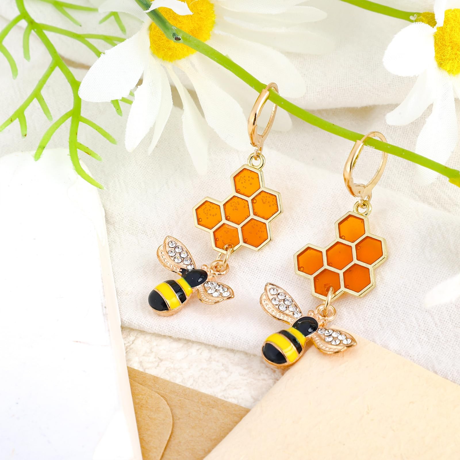 как выглядит Bee Earrings for Women Gold Honeycomb Huggie Hoop Earrings Long Bumble Bee Dangl фото
