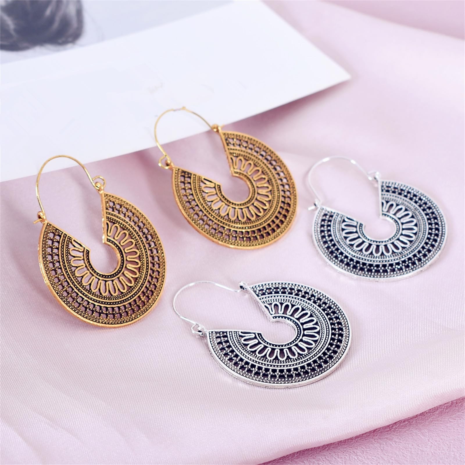 Boho Antique Carved Flower Dangle Drop Earrings for Women Vintage Retro Handmade