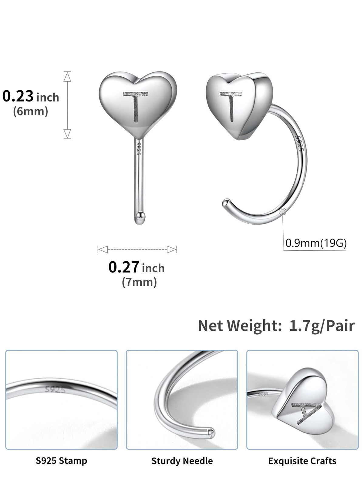 Half Hoops Heart Earrings Studs, 925 Sterling Silver Tiny Sleeper Earrings for W