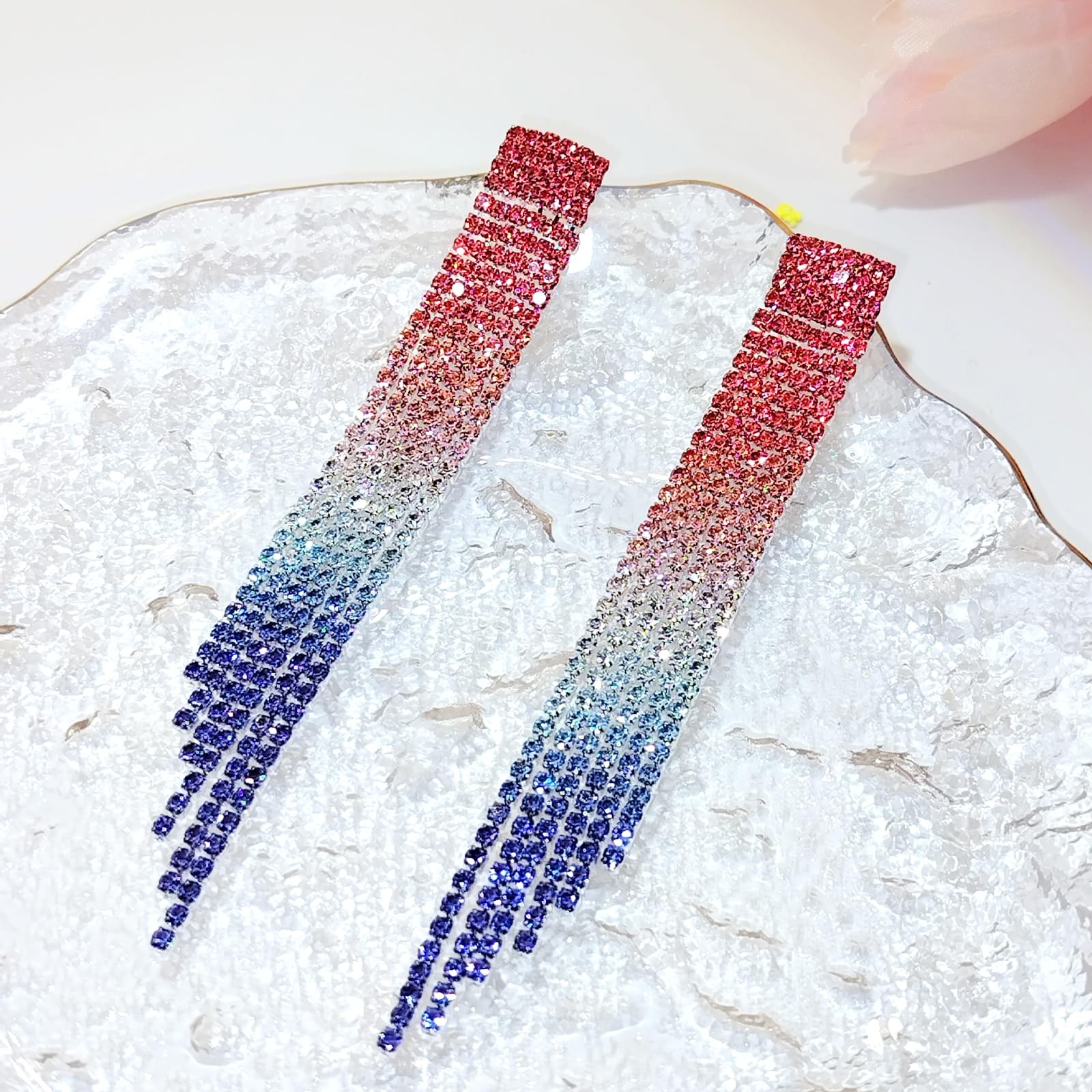как выглядит Long Rhinestone Earrings Red White and Blue earrings Dangling Sparkly Colourful фото