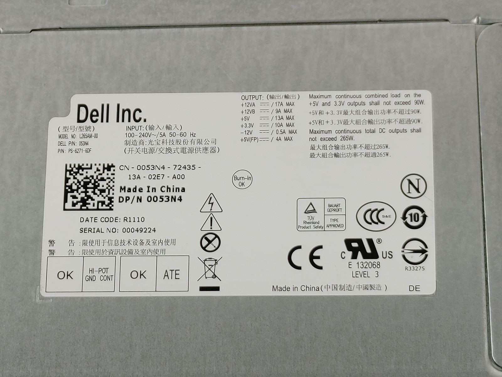 Lot of 5 Dell OptiPlex 3010 MT 265W 24 Pin Desktop Power Supply 053N4