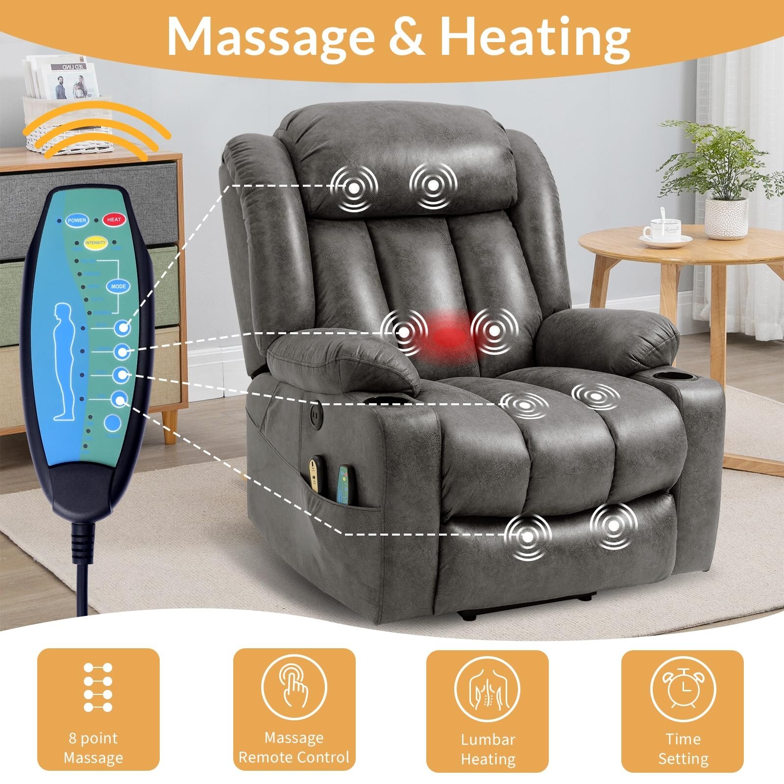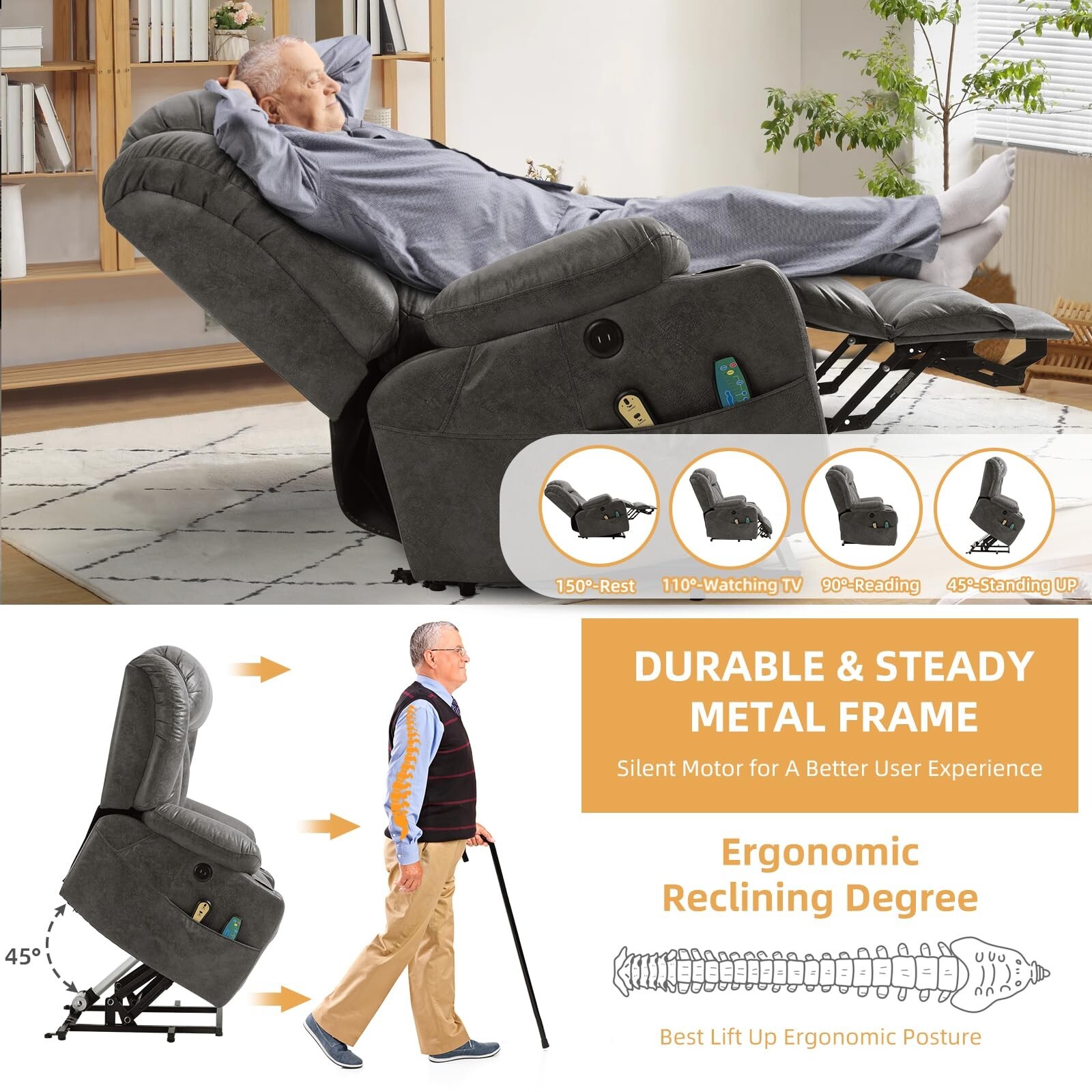Особенности: 2 Cup Holders, 2 USB Charging Ports, 4 Side Pockets, Extend Footrest, Massage & Heating, Overstuffed Padding, Power Lift Assistance, Reclinable, Silent Lift Motor