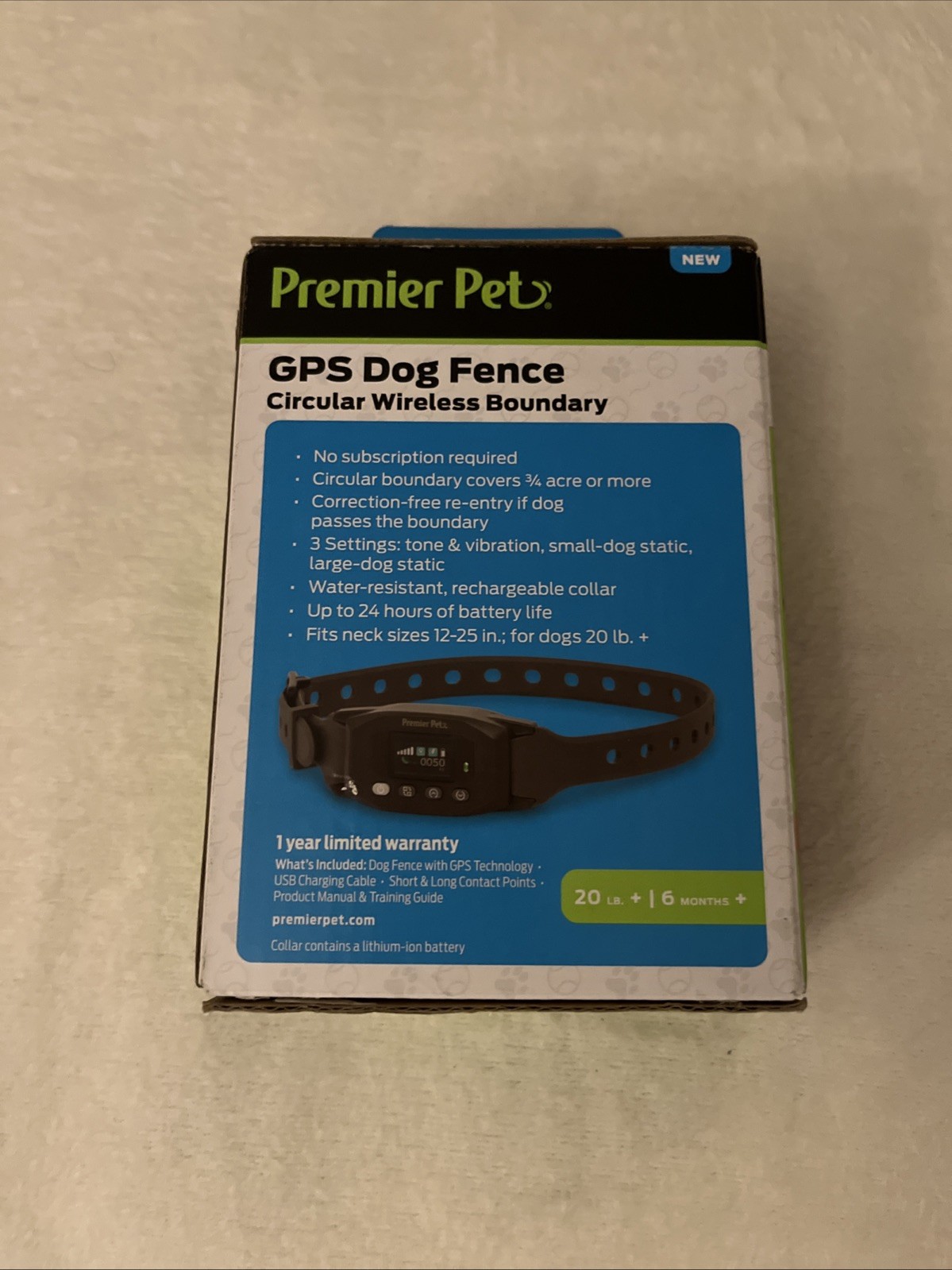 PREMIER PET GPS DOG FENCE CIRCULAR WIRELESS BOUNDARY DOG COLLAR 20LBS 6 MONTH