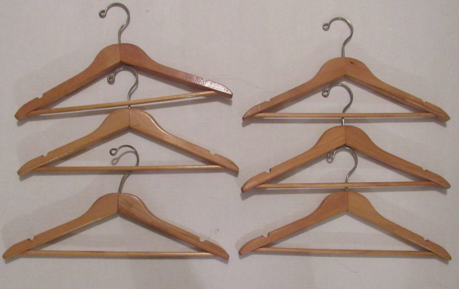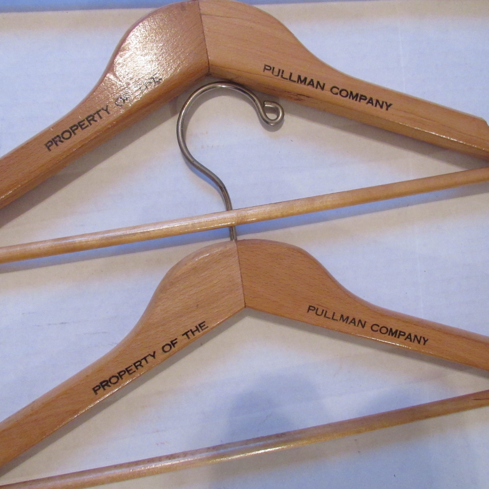 как выглядит Vtg Lot 6 Wood Wooden Clothes Coat Hangers The Pullman Company Train 17" фото