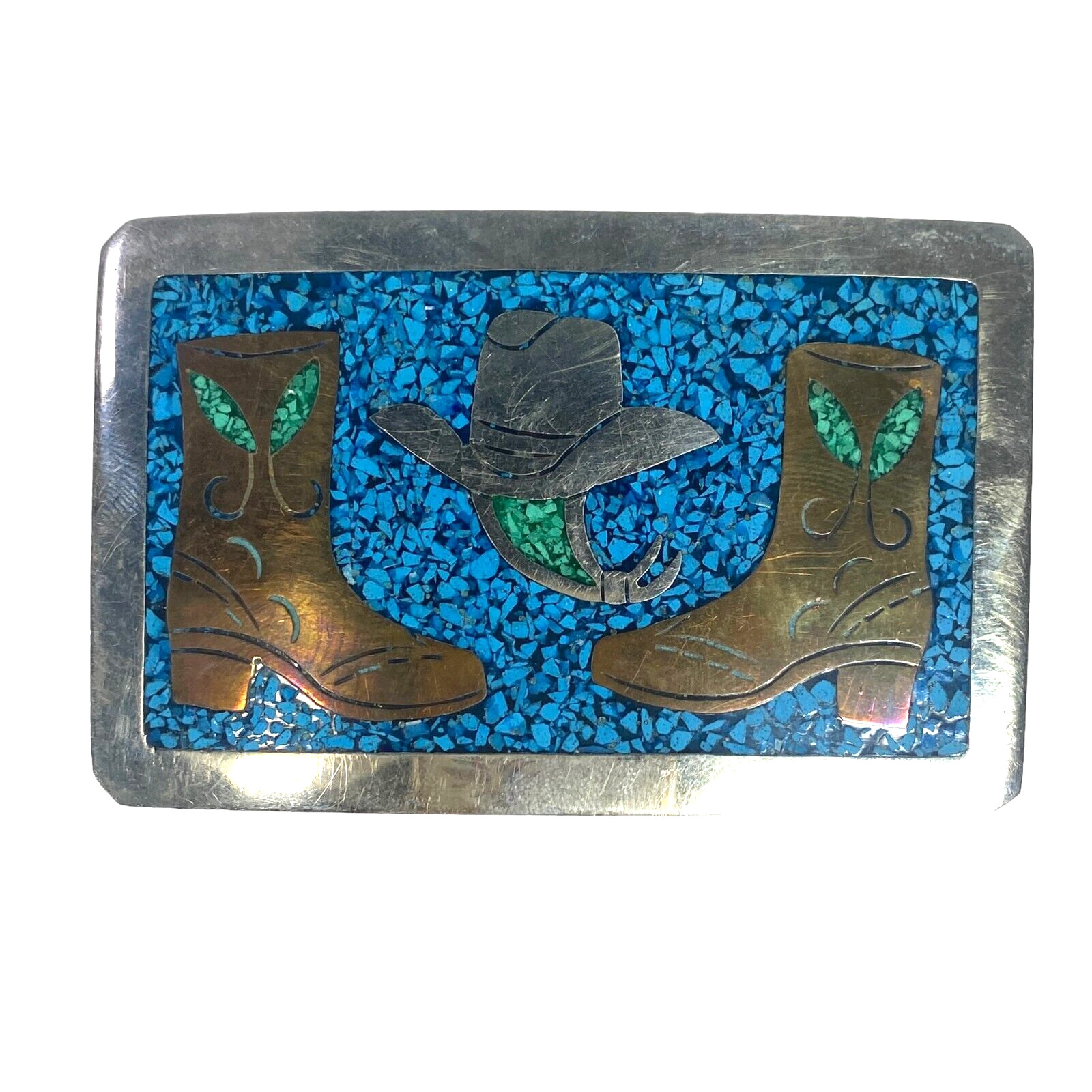 Vintage Mexico Silver Belt Buckle Turquoise Copper Inlay Cowboy Hat Boots 1980's