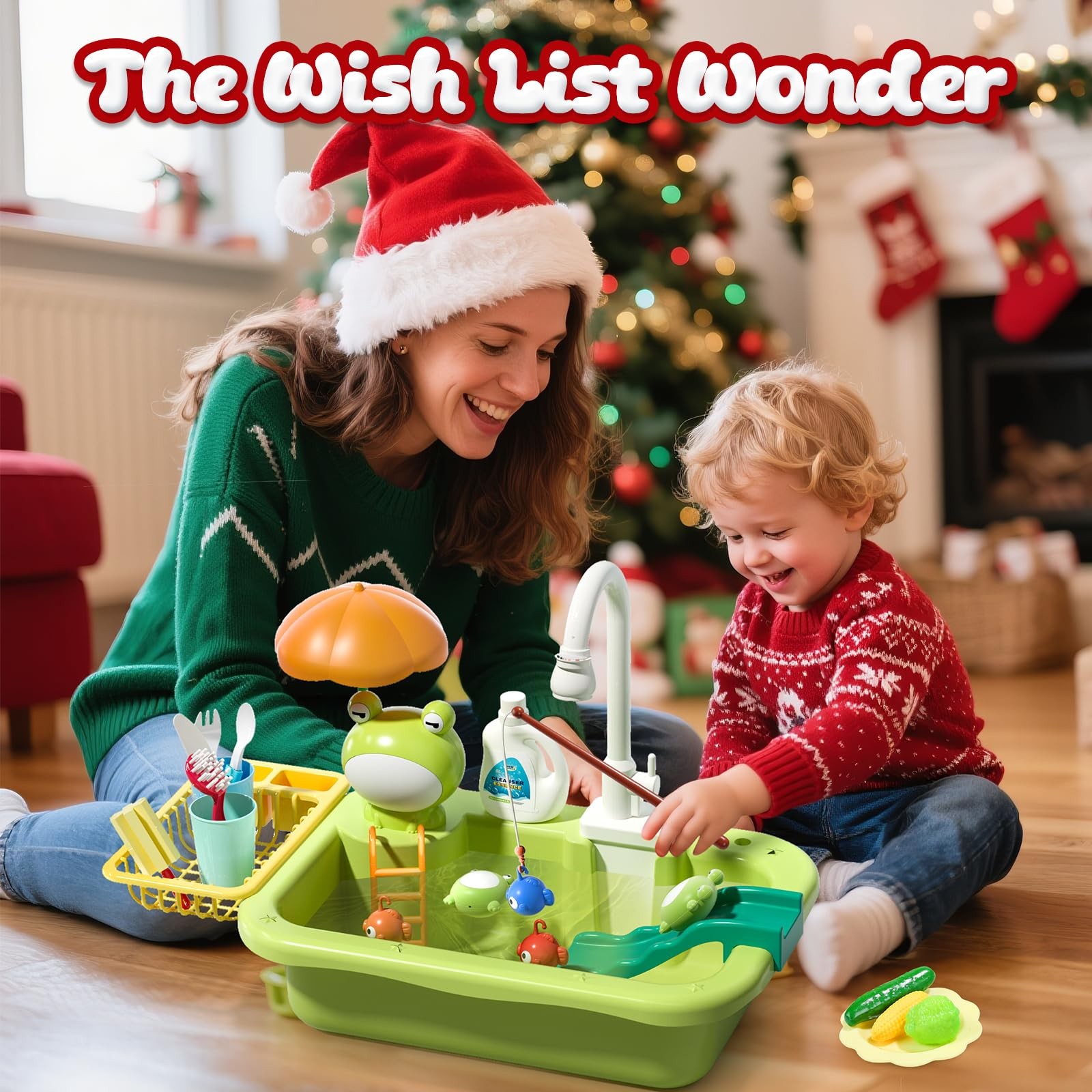 Included Components: Play sink, fishing toys, floating toys, play food, cups, plates