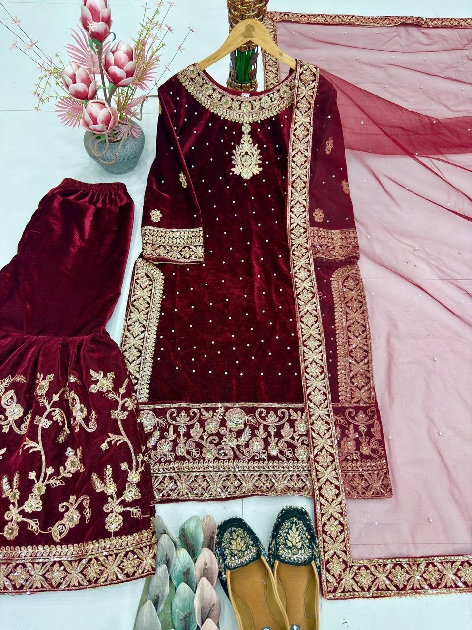 как выглядит Designer Maroon Velvet Kurta Palazzo With Net Dupatta For Reception Party фото