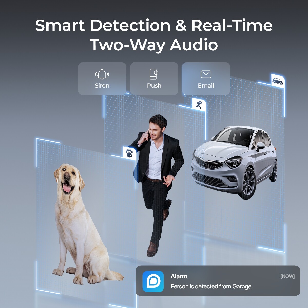 Smart Alarm: Motion detection, person detection, vehicle detection, animal detection