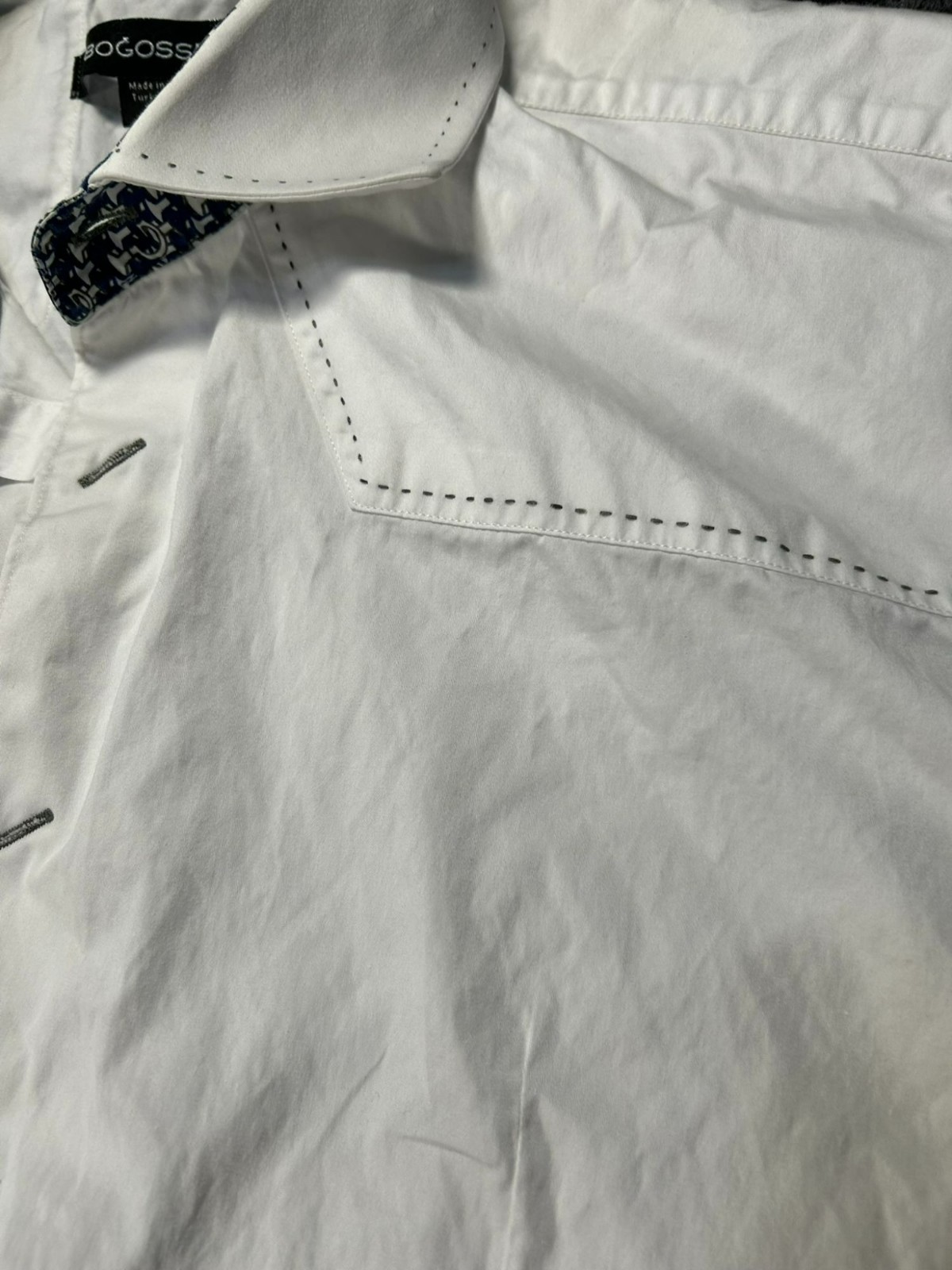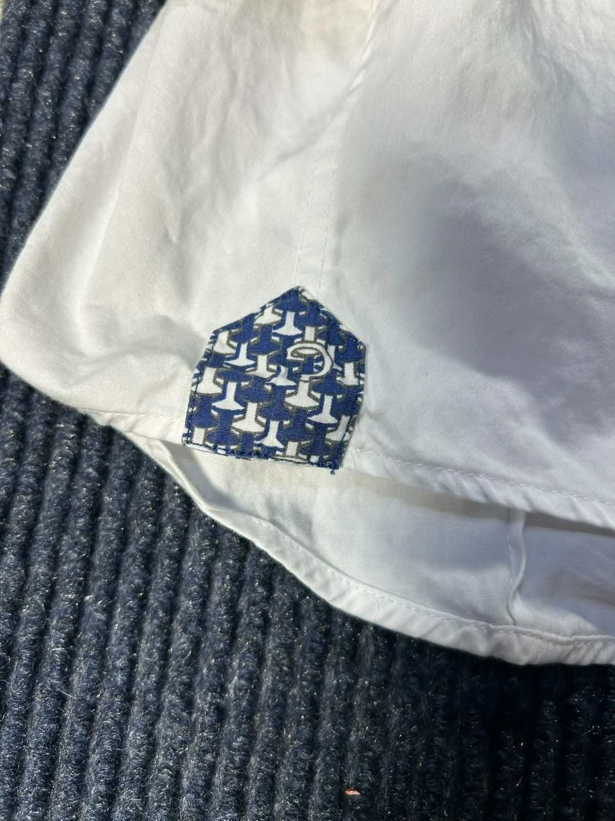 Men's Bogosse White Button-Down Shirt Blue Patterned Collar Accents Size 7