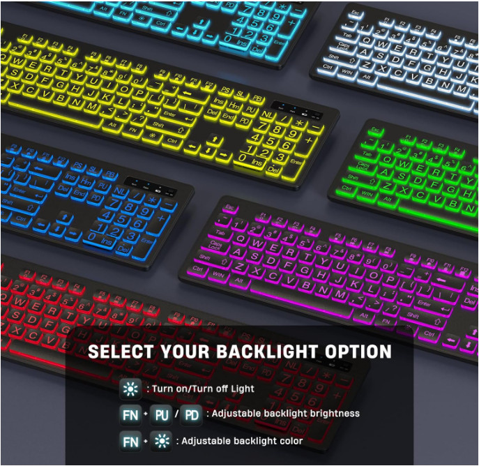Large Print Wireless Keyboard and Mouse - 7 Colors Backlit Keyboard,Rechargeable