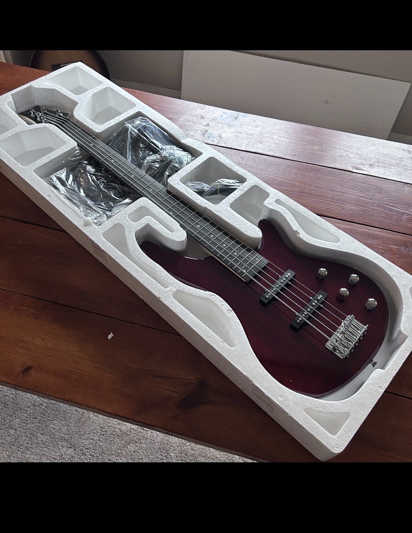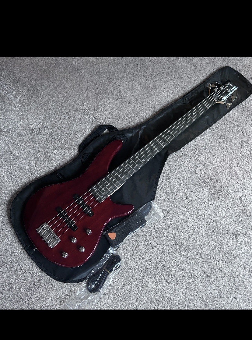 как выглядит 5 String Electric Bass Guitar with 24 Frets, Trans Red Clay Finish, with Gig Bag фото