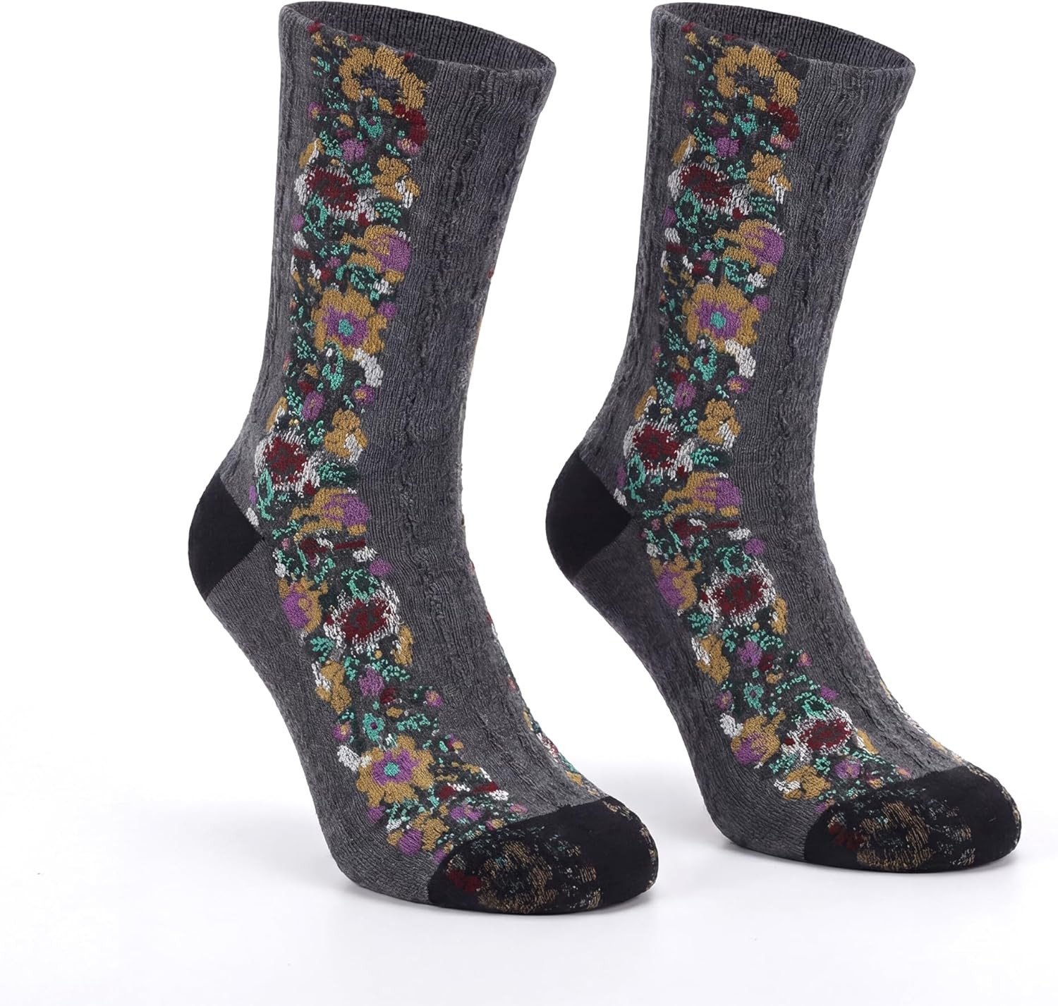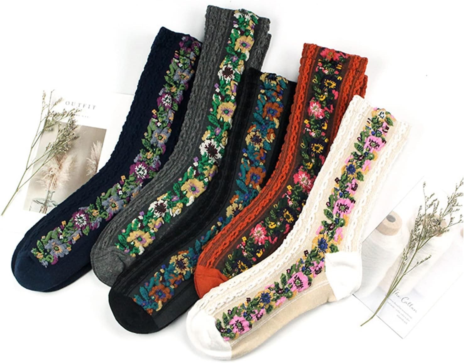 5 Pairs Women's Floral Design Vintage Crew Socks Ethnic Jacquard Knit Set,...