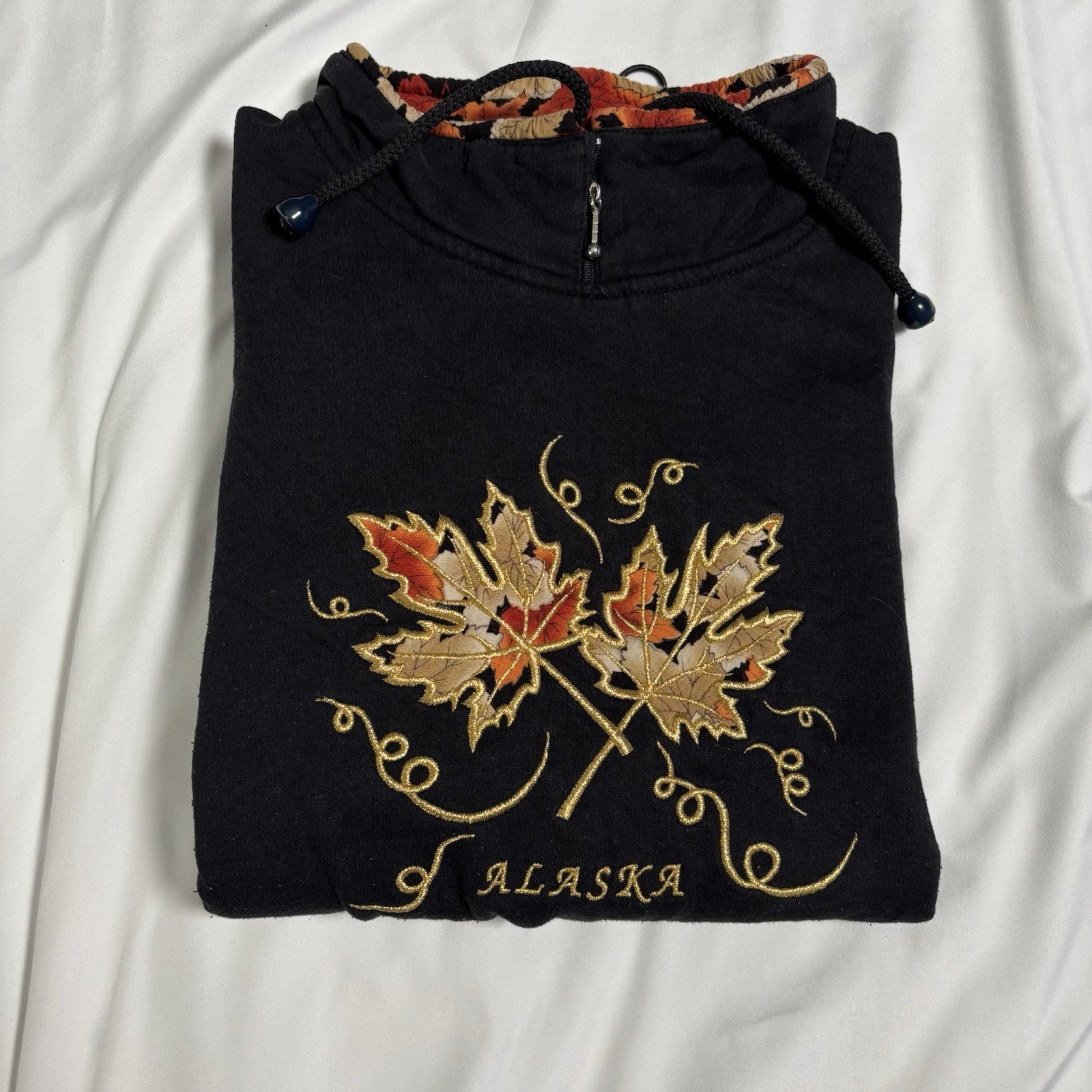 как выглядит Vintage 90s Black Sweatshirt Gold Embroidered Alaska Fall Leaves w/ Zip Collar фото