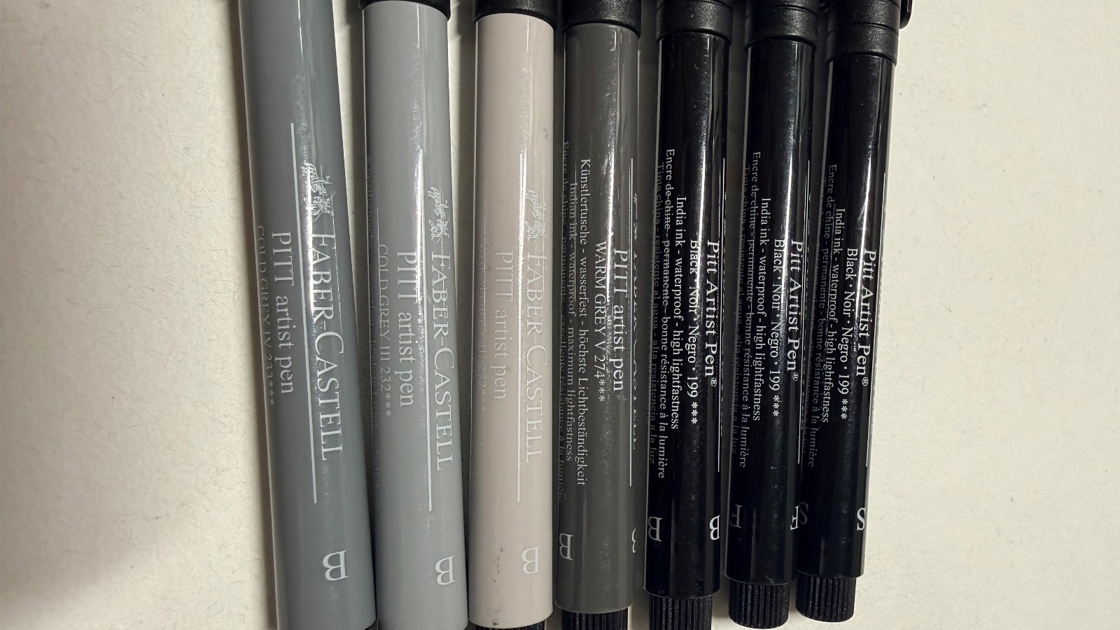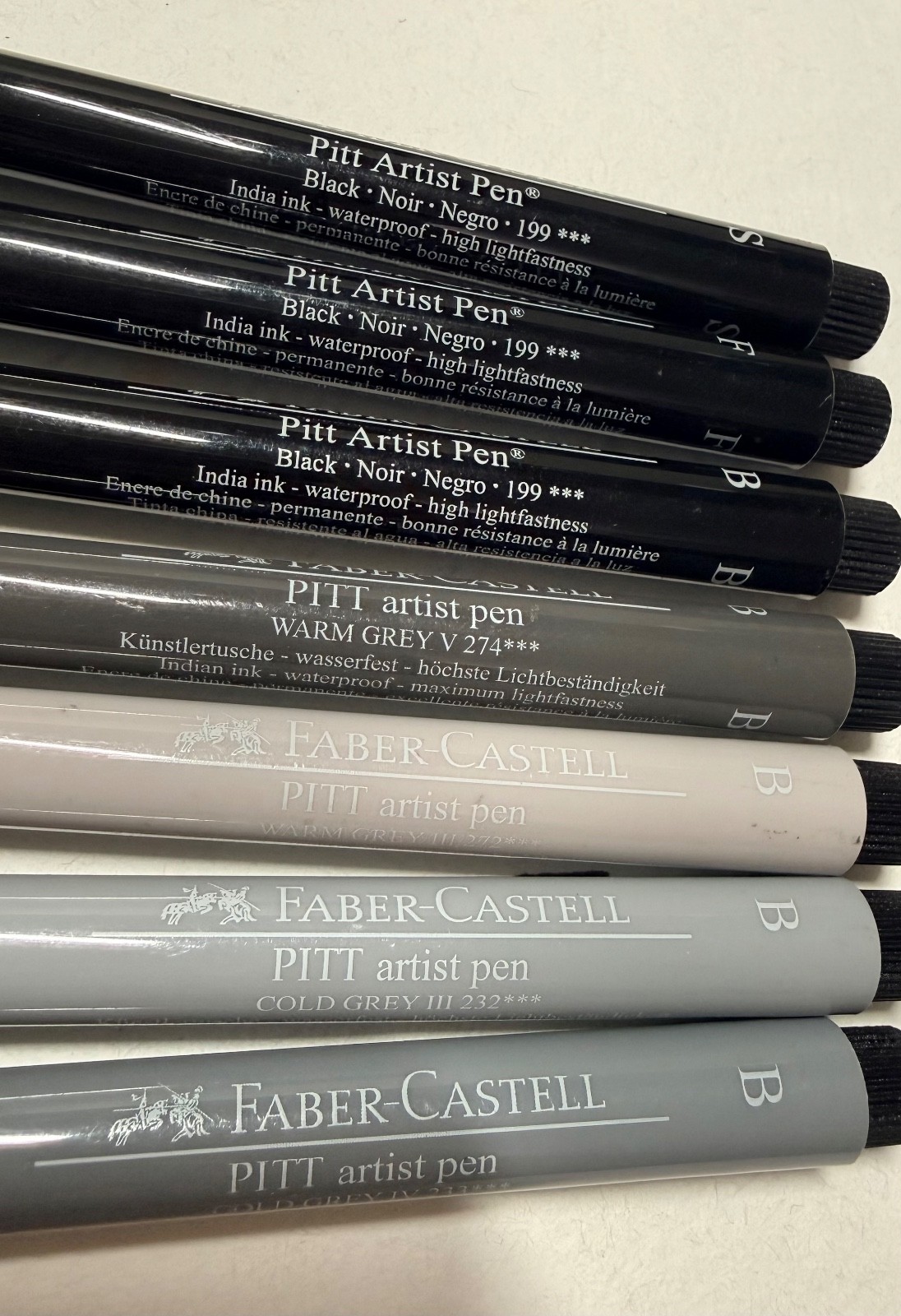 Faber Castell PITT Artist Pens. From Small-Fine-Brush tips. Gray Tones. Set of 7