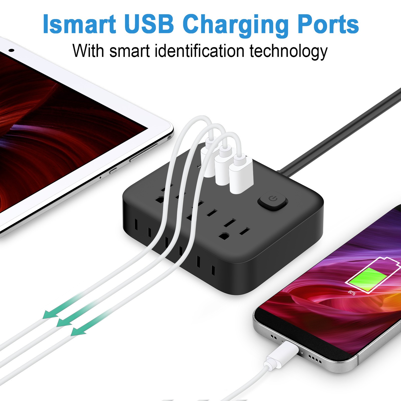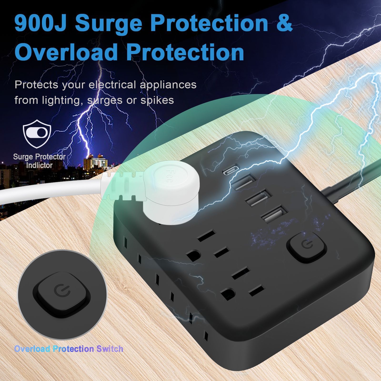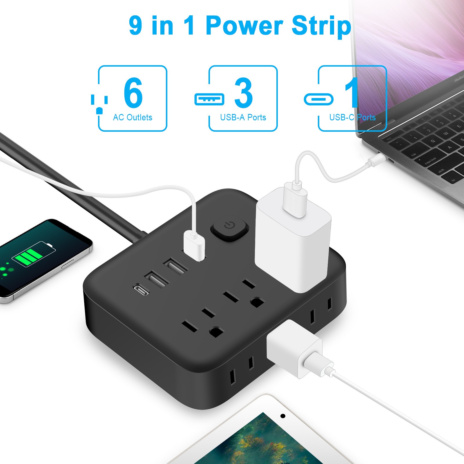 Surge Protector Power Strip- Flat Plug Extension Cord with 6AC Outlets and 4 USB