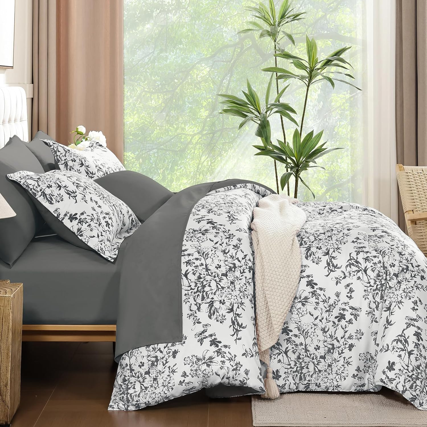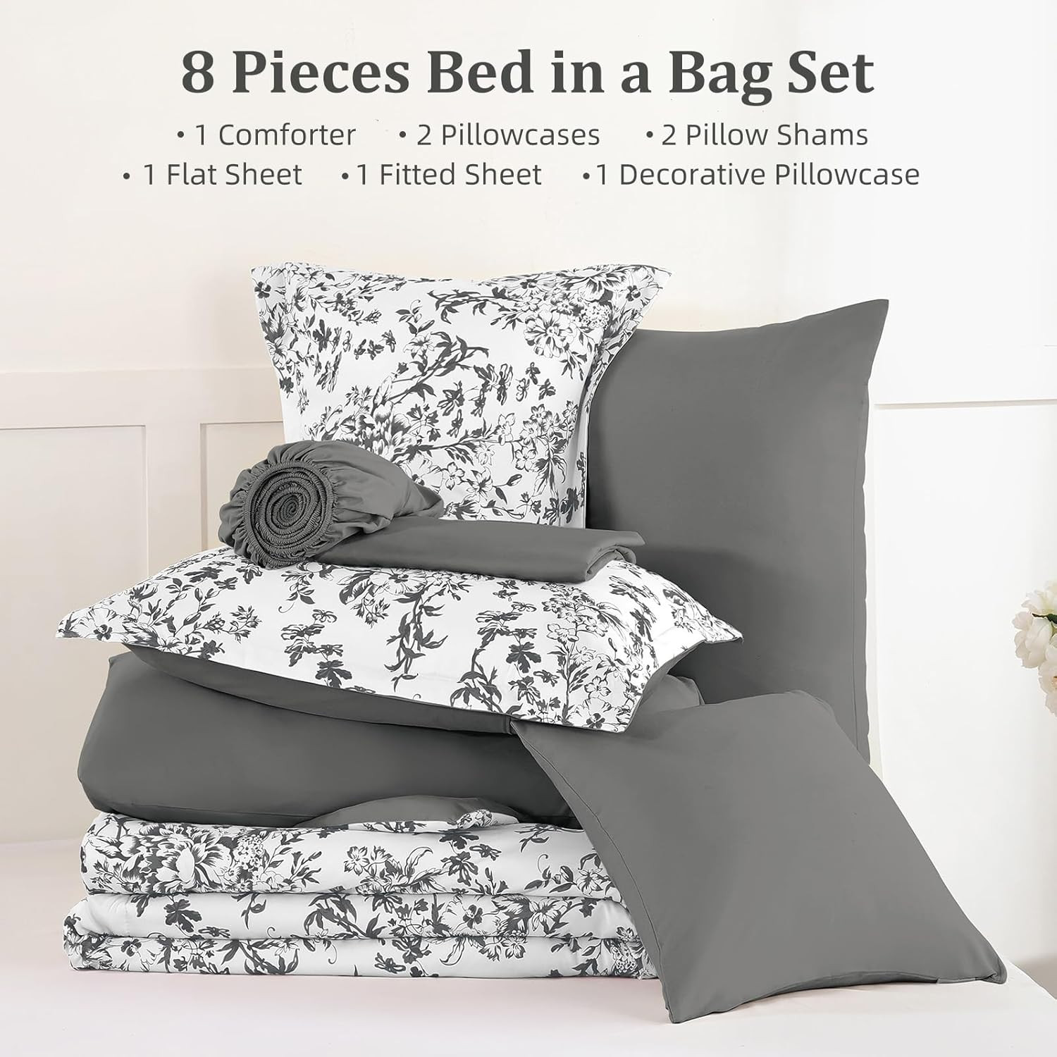 Queen Size Comforter Set, 8 Pieces Grey Floral Bed in a Bag Comferter Sets, Bota