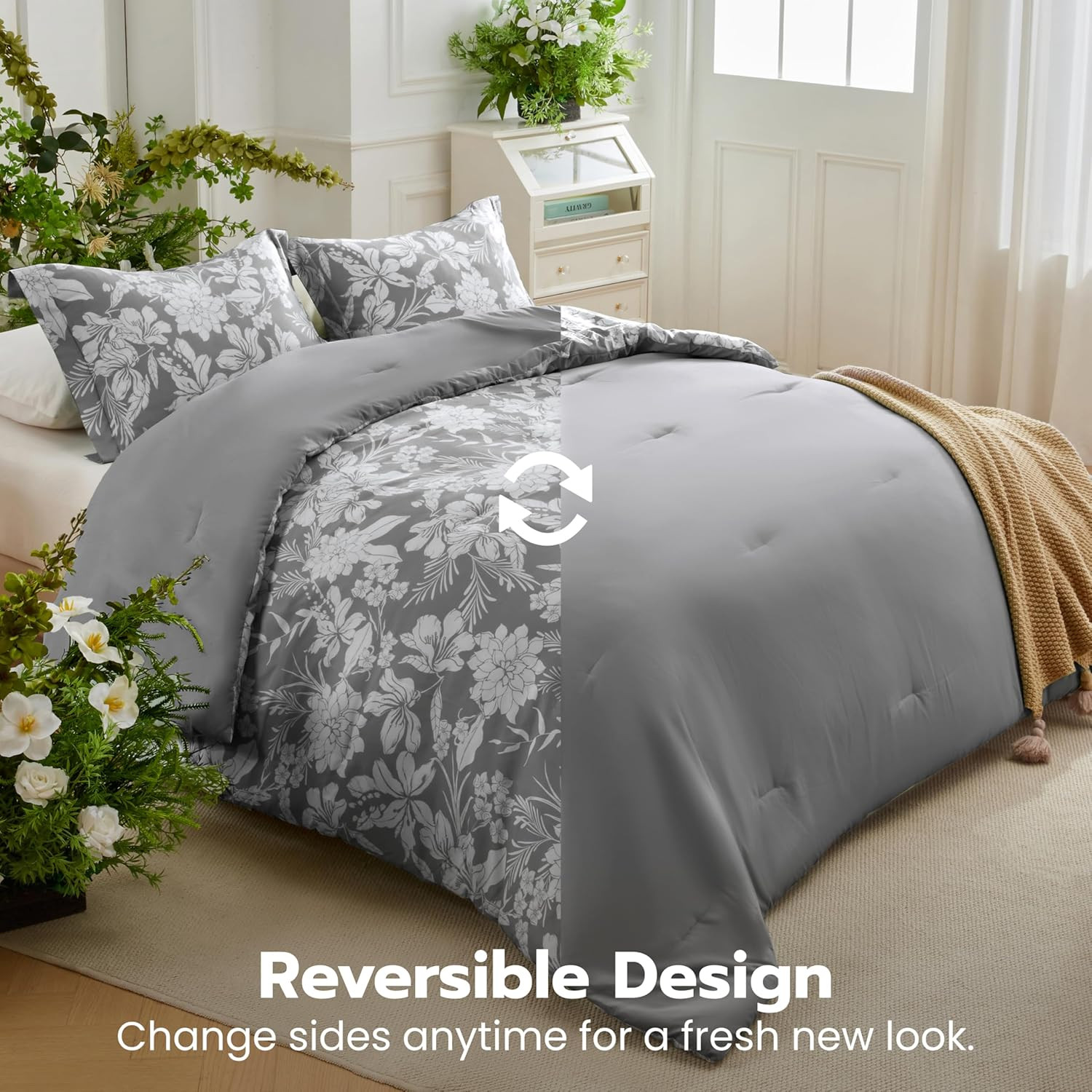 King Size Comforter Set Grey, 3 Pieces Floral King Bedding Set with 1 Soft Rever